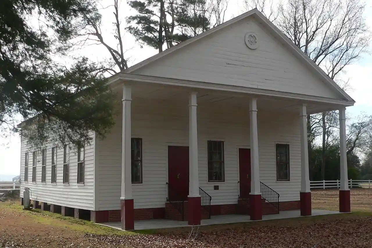 Asbury Methodist Church, also known as Asbury Memorial Church and Asbury Methodist Episcopal Church South, is a historic Methodist church located at Raynham, Robeson County, North Carolina. It was built in 1861, and is a one-story, timber-frame building in a modest Greek Revival style. It measures approximately 40 feet by 50 feet and features a prominent, projecting, pedimented front gable supported by five posts. Adjacent to the church is the contributing cemetery with approximately 200 marked graves. The oldest grave dates to 1848. Read more on Wikipedia