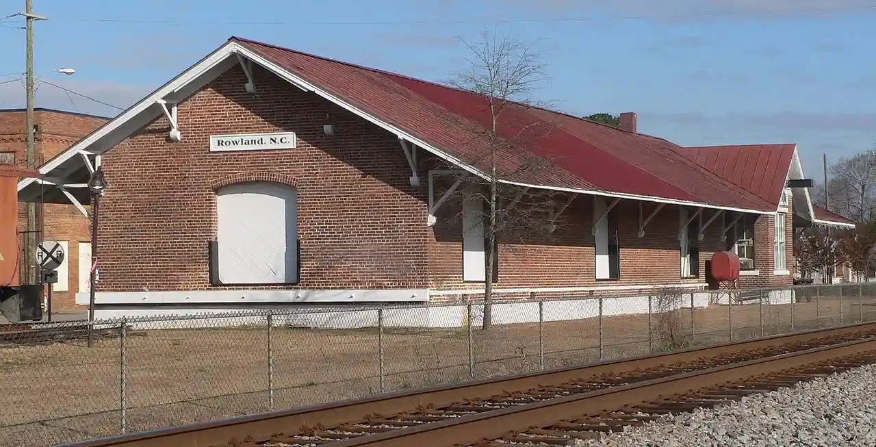 Rowland Depot is a historic train station located at Rowland, Robeson County, North Carolina. It was built in 1925 by the Atlantic Coast Line Railroad. It is a one-story, "L"-plan, hip roofed brick structure in the Bungalow / American Craftsman style. It rests on a poured concrete foundation and the roof has wide, sheltering overhangs on the hipped main block and the gable end freight wing supported by Craftsman style triangular wooden brackets. Read more on Wikipedia