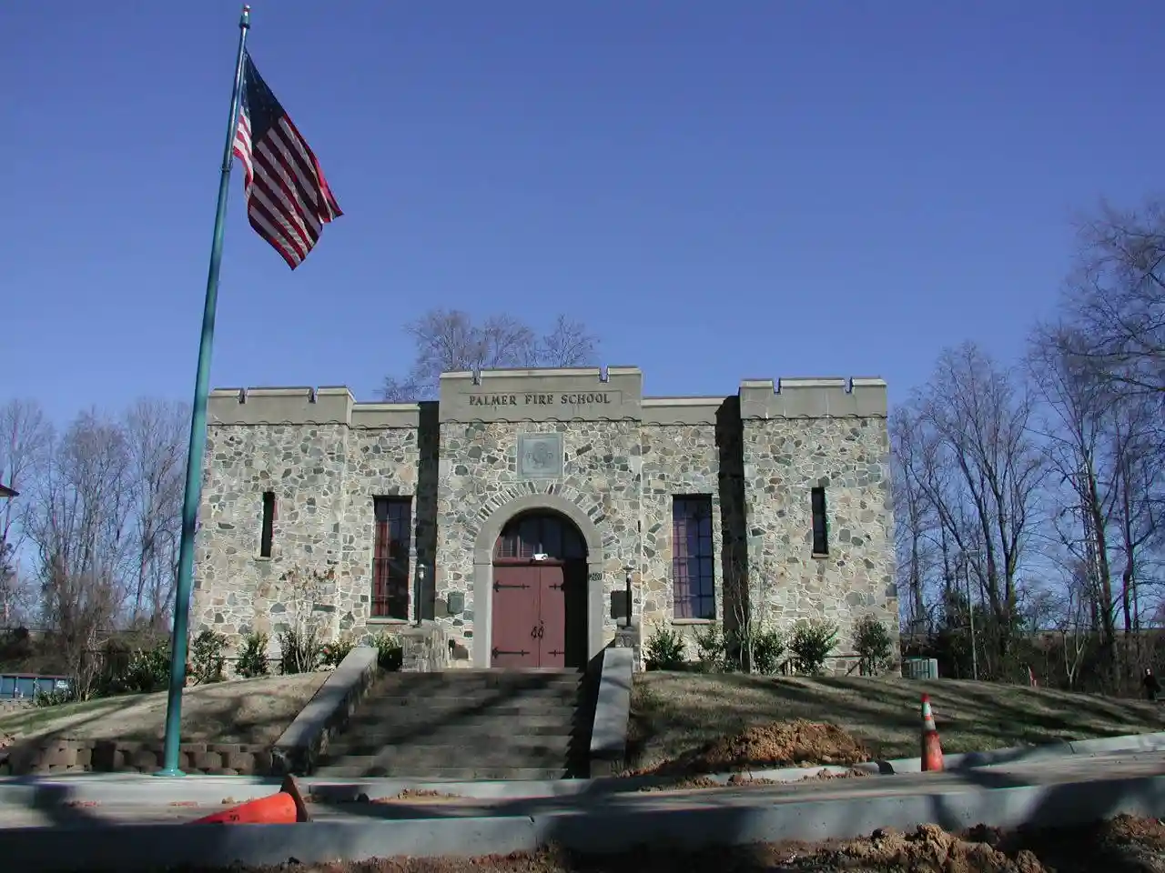 Palmer Fire School, also known as Firemen's Hall, is a historic school complex for firefighters located at Charlotte, Mecklenburg County, North Carolina. The complex consists of the 1940, one-story, rock-faced assembly hall and the 1938, six-story, red-brick training tower. The assembly hall is a Late Gothic Revival style building, five bays wide with a stuccoed, crenellated parapet and projecting end bays. Its construction was funded by the Works Progress Administration (WPA) and was the only drill school for firemen funded by the WPA. Read more on Wikipedia
