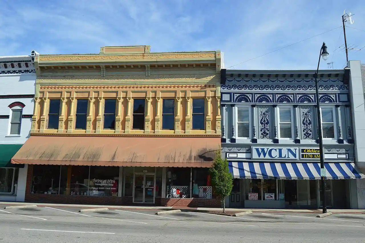 Bethune-Powell Buildings are two historic commercial buildings located at Clinton, Sampson County, North Carolina. They were built in 1902, and are two-story, brick buildings with decorative pressed metal sheathing and brick cornices on the front facade. The Bethune Building is six bays wide and the Powell Building three bays wide. The pressed metal sheathing features a robust pattern of colonnaded, arched garland friezes, and modillion cornice. The buildings were constructed following a fire that destroyed much of the Clinton commercial district. Read more on Wikipedia