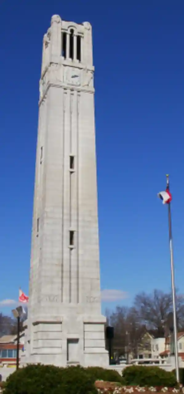 The North Carolina State University Memorial Belltower (officially the Memorial Tower, informally known as the Belltower) is a free-standing bell tower on the Main Campus of North Carolina State University in Raleigh, North Carolina Conceived as a war memorial to honor university alumni killed in World War I and the university's overall participation in the conflict, the Belltower now serves as a perpetual memorial for N.C. State students and alumni who gave their lives in the service of the nation. A prominent university symbol, the tower is a popular rallying point for the campus community. Read more on Wikipedia