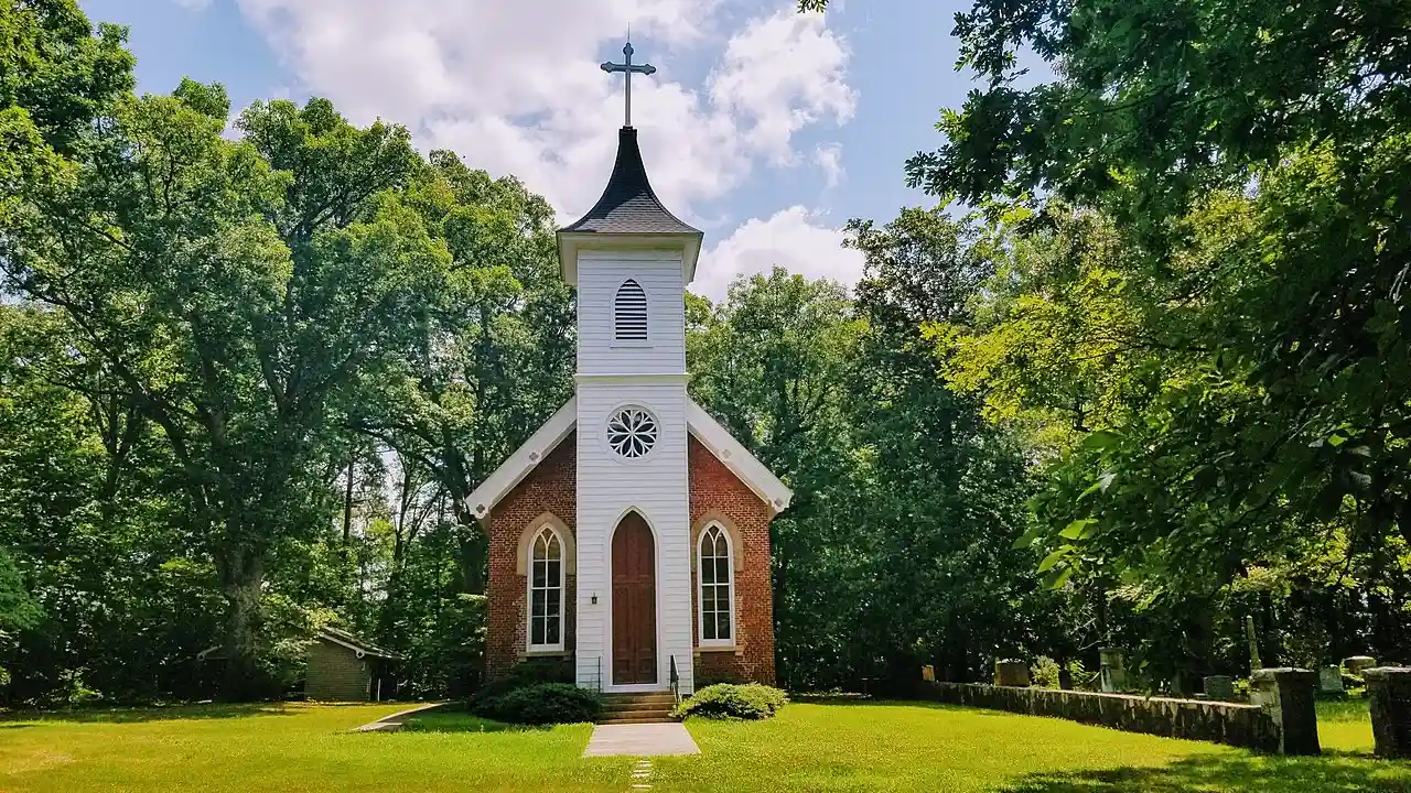 Chapel of the Good Shepherd is a historic Episcopal chapel located near Ridgeway, Warren County, North Carolina. It was built in 1871, and is a one-story, three bay by three bay, Gothic Revival style brick chapel. It features a three-stage red-painted wooden entrance tower with a concave pyramidal roof. Read more on Wikipedia