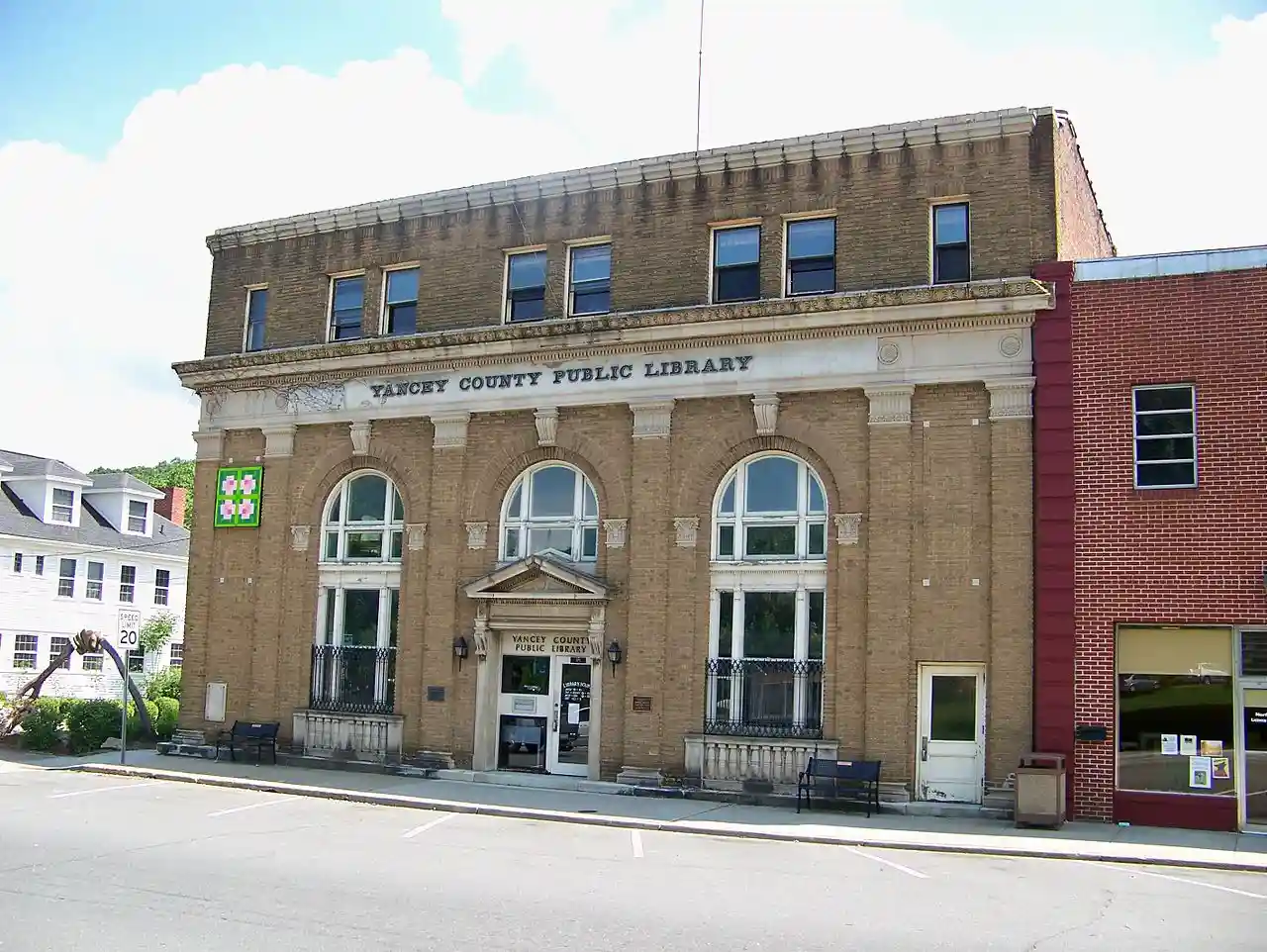 Citizens Bank Building, also known as the Yancey County Public Library Building, is a historic bank building located at Burnsville, Yancey County, North Carolina. It was built in 1925, and is a three-story, yellow brick Renaissance Revival style building. The front facade features fluted Corinthian order pilasters and arched brick openings. The building housed a bank until 1972, when it was donated for use as a county library. Read more on Wikipedia