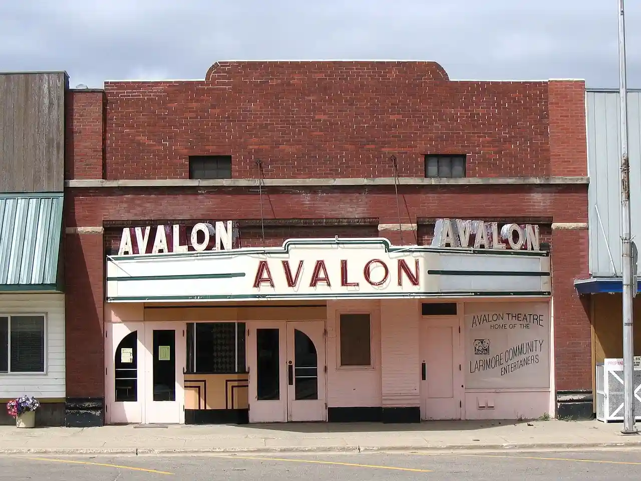 The Avalon Theater is a Historic Art Deco style Movie theater located in the commercial district of Larimore, North Dakota, United States. Built in 1938 as a 350-seat theater, the Avalon's most significant feature is its Art Deco detailing, especially the marquee, box office, and entry doors and continuing with simple Art Deco geometry motifs in the interior, all of which has survived. The building is constructed of brick with a parabolic poured concrete floor in the seating area to ensure a good view for all. The building still functions as a movie theater, with its original projectors, and also is home to local live theater groups. Read more on Wikipedia