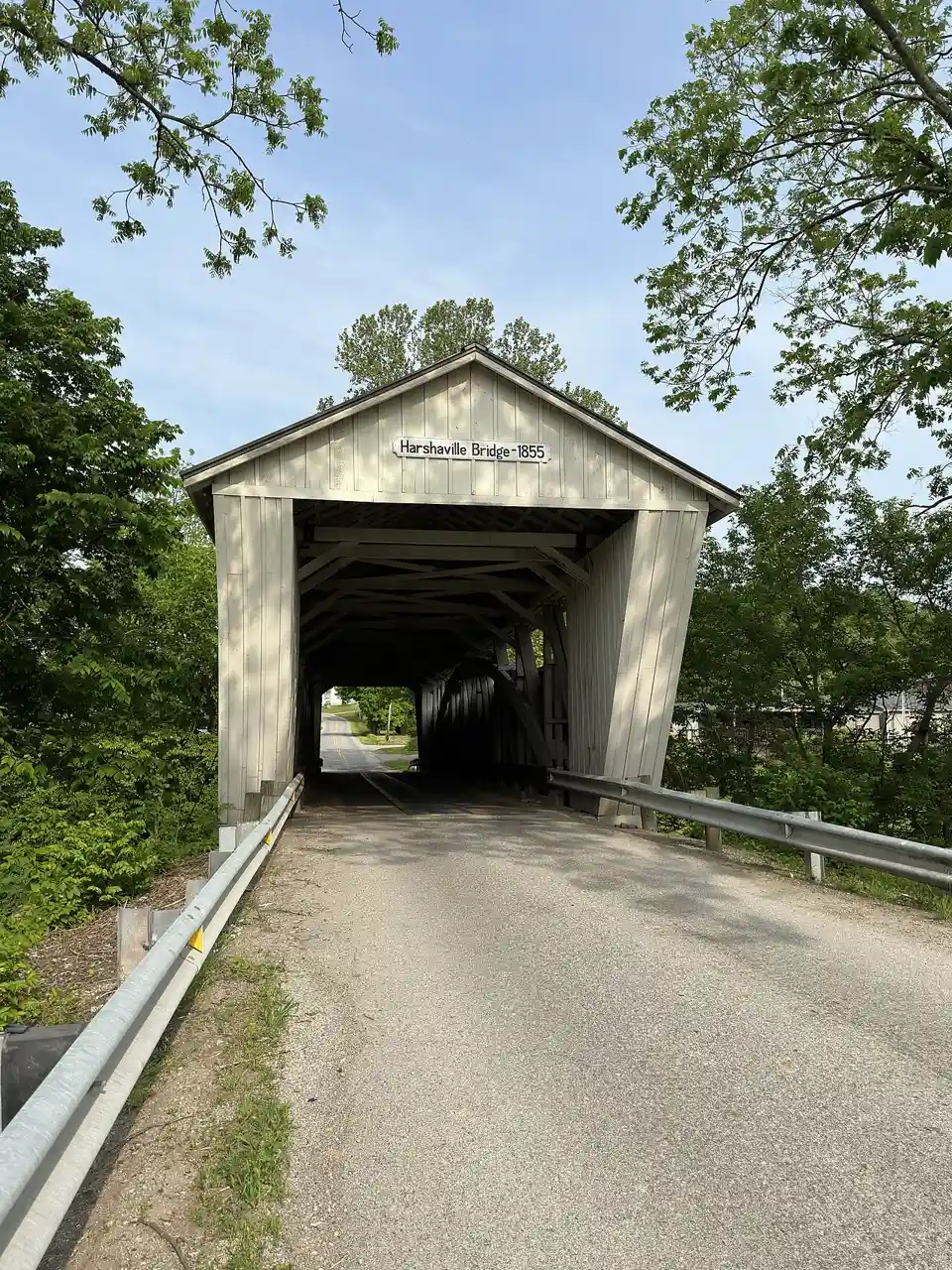 The Harshaville Covered Bridge is a historic covered bridge spanning the Cherry Fork Creek at Harshaville, Adams County, Ohio, United States. Built in 1855, it is a Burr truss bridge with a 110-foot span. It has sheet metal siding, a metal roof and stone abutments. It was listed on the National Register of Historic Places in 1976. Read more on Wikipedia