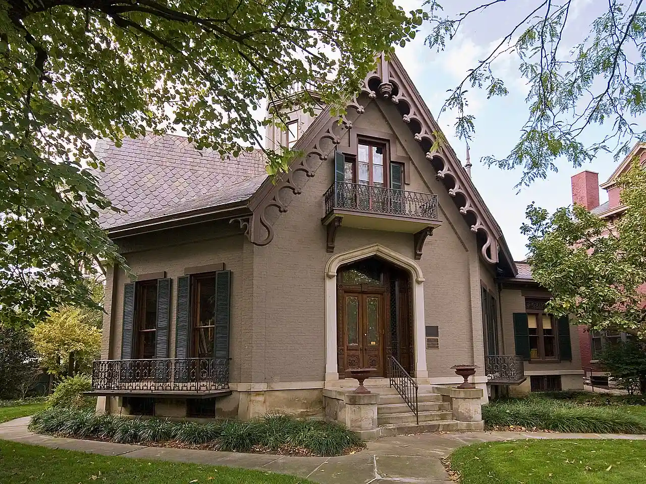 The Lane–Hooven House is a historic house museum in Hamilton, Ohio. Built in 1863 for Clark Lane, a Hamilton industrialist and philanthropist, the octagonal house features a brick exterior with Gothic Tudor elements. Other features include an open spiral staircase extending from the basement to the third floor turret, cast-iron fence, a greenhouse and a fountain. It was listed in the National Register on October 25, 1973. Read more on Wikipedia