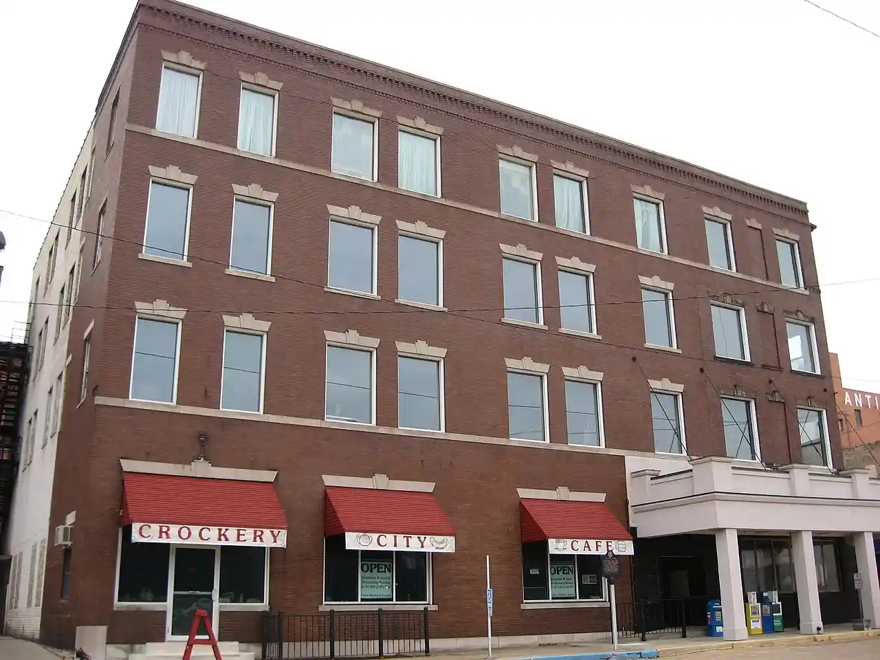 The Travelers Hotel, in East Liverpool, Ohio, was built in 1907 and had 105 rooms. Located at 117 East Fourth Street, on the banks of the Ohio River, it is one of the few remaining river town hotels that faces the river. The original name of the hotel is the Landora. Read more on Wikipedia