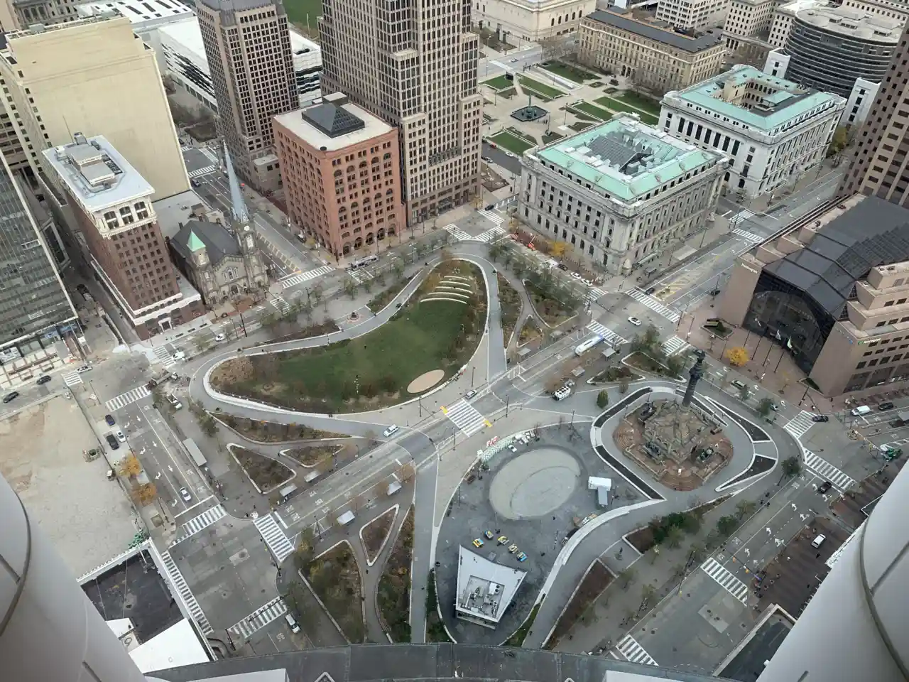 Public Square is the central plaza of Downtown Cleveland, Ohio. Based on an 18th-century New England model, it was part of the original 1796 town plat overseen by city founder General Moses Cleaveland of the Connecticut Land Company. The historical center of the city's downtown, it was added to the National Register of Historic Places in 1975. Read more on Wikipedia