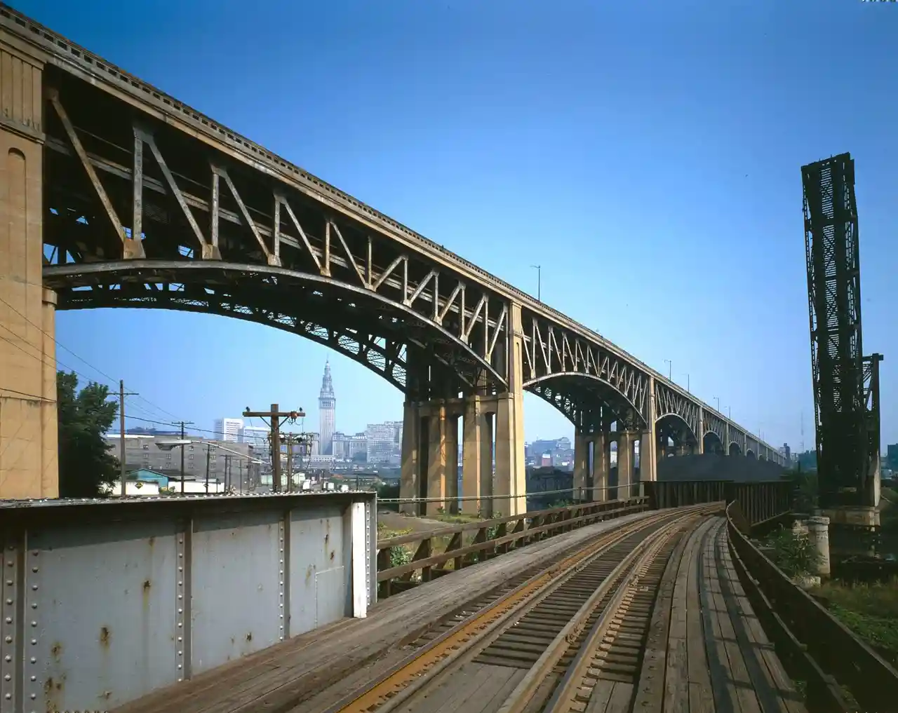 The Hope Memorial Bridge (formerly the Lorain–Carnegie Bridge) is a art deco truss bridge crossing the Cuyahoga River in Cleveland, Ohio. The bridge connects Lorain Avenue on Cleveland's west side and Carnegie Avenue on the east side, terminating just short of Progressive Field. Read more on Wikipedia
