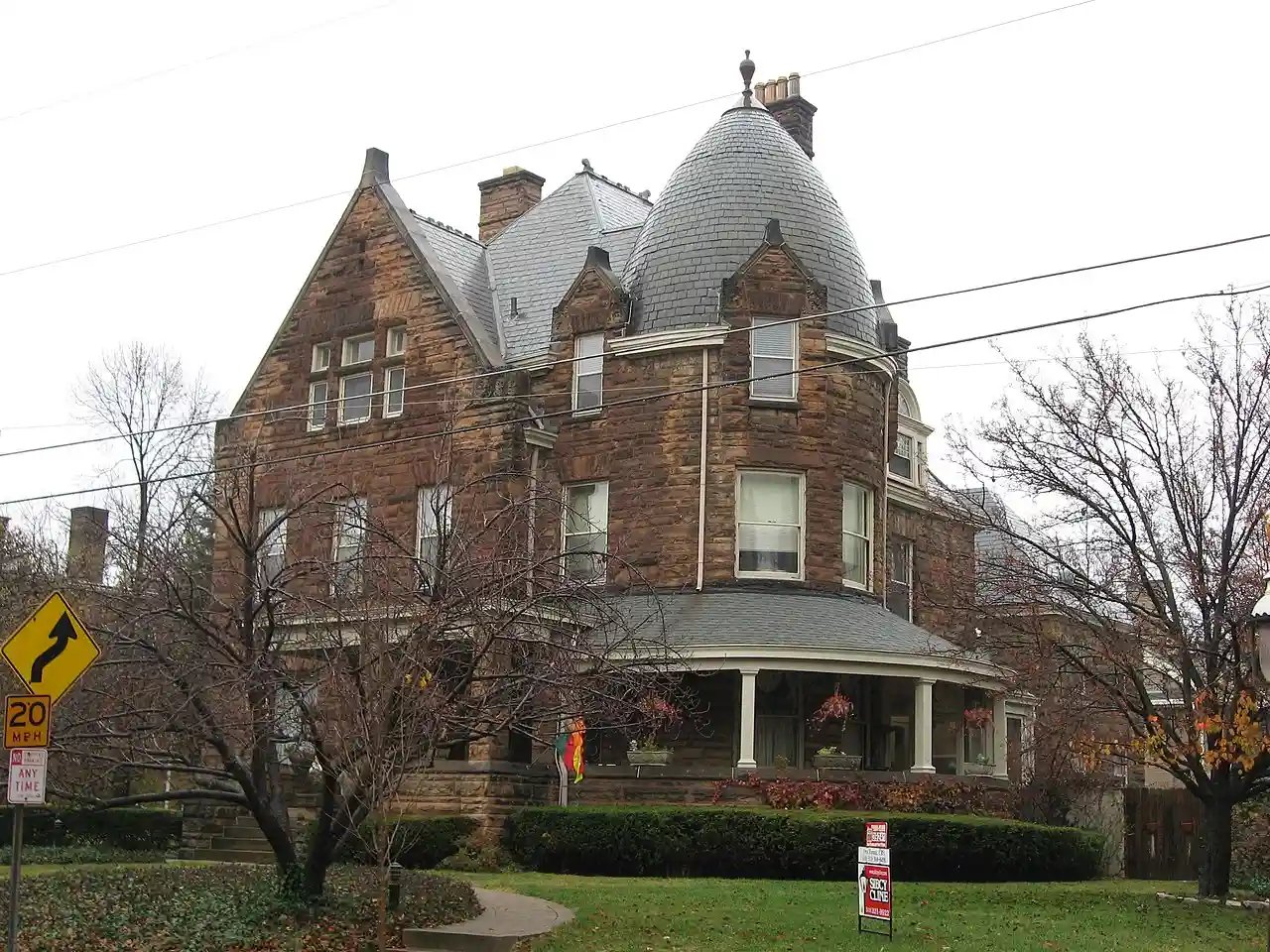 The Charles B. Russell House (also known as the "Duffel Building") is a historic residence in the Clifton neighborhood of Cincinnati, Ohio, United States. Built in 1890, it is a large two-and-a-half-story house constructed primarily of limestone. Multiple windows, including several dormer windows, pierce all sides of the turret, while another large dormer window with Palladian influences is present on the house's southern side. A common theme in the design of the house's windows are string courses of stone that connect the windows and voussoirs that radiate out from the windows to many directions. Among its most distinctive architectural elements are the heavy stone front porch, which transitions from a verandah on one end to a sun porch on the other end, and the large circular turret on the front corner of the house, which is capped with a beehive-shaped pinnacle.Owen, Lorrie K., ed. Dictionary of Ohio Historic Places. Vol. 1. St. Clair Shores: Somerset, 1999, 662-663. Read more on Wikipedia