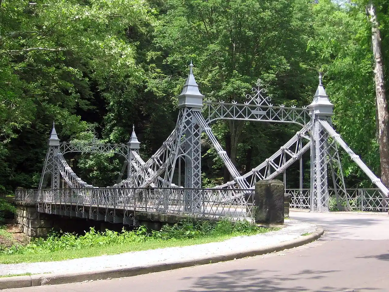 The Mill Creek Park Suspension Bridge is a bridge in Youngstown, Ohio, United States. The 1895 bridge carries Valley Drive across Mill Creek to connect the east and west sides of Mill Creek Park. Following the wishes of Volney Rogers to create fanciful park entrances, Charles Fowler of the Youngstown Bridge Co. designed the structure. The Suspension Bridge is the oldest of six bridges in Mill Creek Park. It measures 86 feet long and 32 feet wide and was listed on the National Register of Historic Places in 1976. It has been called the Silver Bridge, the Cinderella Bridge, the Castle Bridge, and the Walt Disney Bridge. Read more on Wikipedia