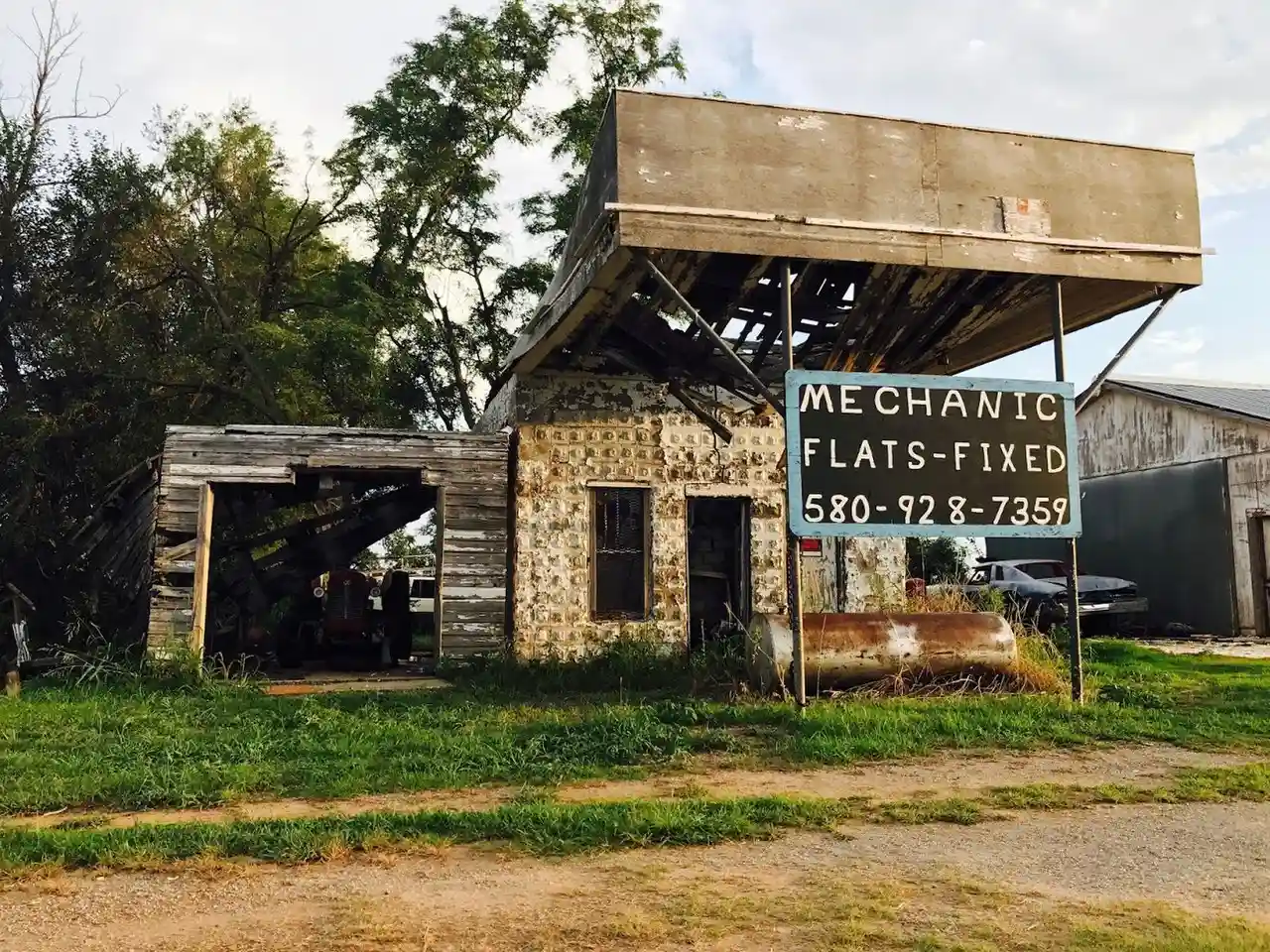 The Magnolia Service Station is a historic service station located on Old U.S. Route 66 in Texola, Oklahoma. The station, an affiliate of the Magnolia Petroleum Company, opened circa 1930. The station was one of the westernmost in Oklahoma and became one of the first stops for eastbound travelers to buy gas and auto services in the state. The main building of the service station is representative of the "house" style of filling station; such stations resembled small houses in order to fit into residential areas. . Read more on Wikipedia