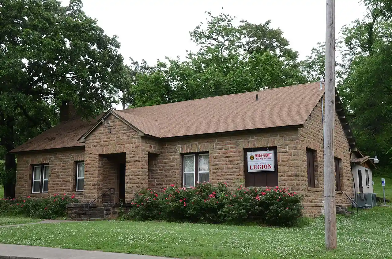 The American Legion Hut in Tehlequah City Park, jct. of E Shawnee St. and N. Brookside Ave., in Tahlequah, Oklahoma was built in 1937 and was listed on the National Register in 2006. It reflects WPA Standardized Style and is also known as Rhodes Pritchett American Legion Hut Post 50 and served as a meeting hall. Read more on Wikipedia