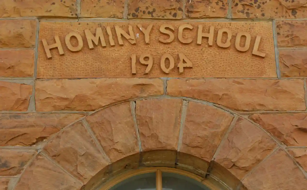 The Hominy School, constructed in 1904, is 50 feet x 40 feet, and 20 feet high. The bell tower was removed in the 1940s, but replaced in 1980 with the original bell. It was the first and oldest school in Hominy. Read more on Wikipedia