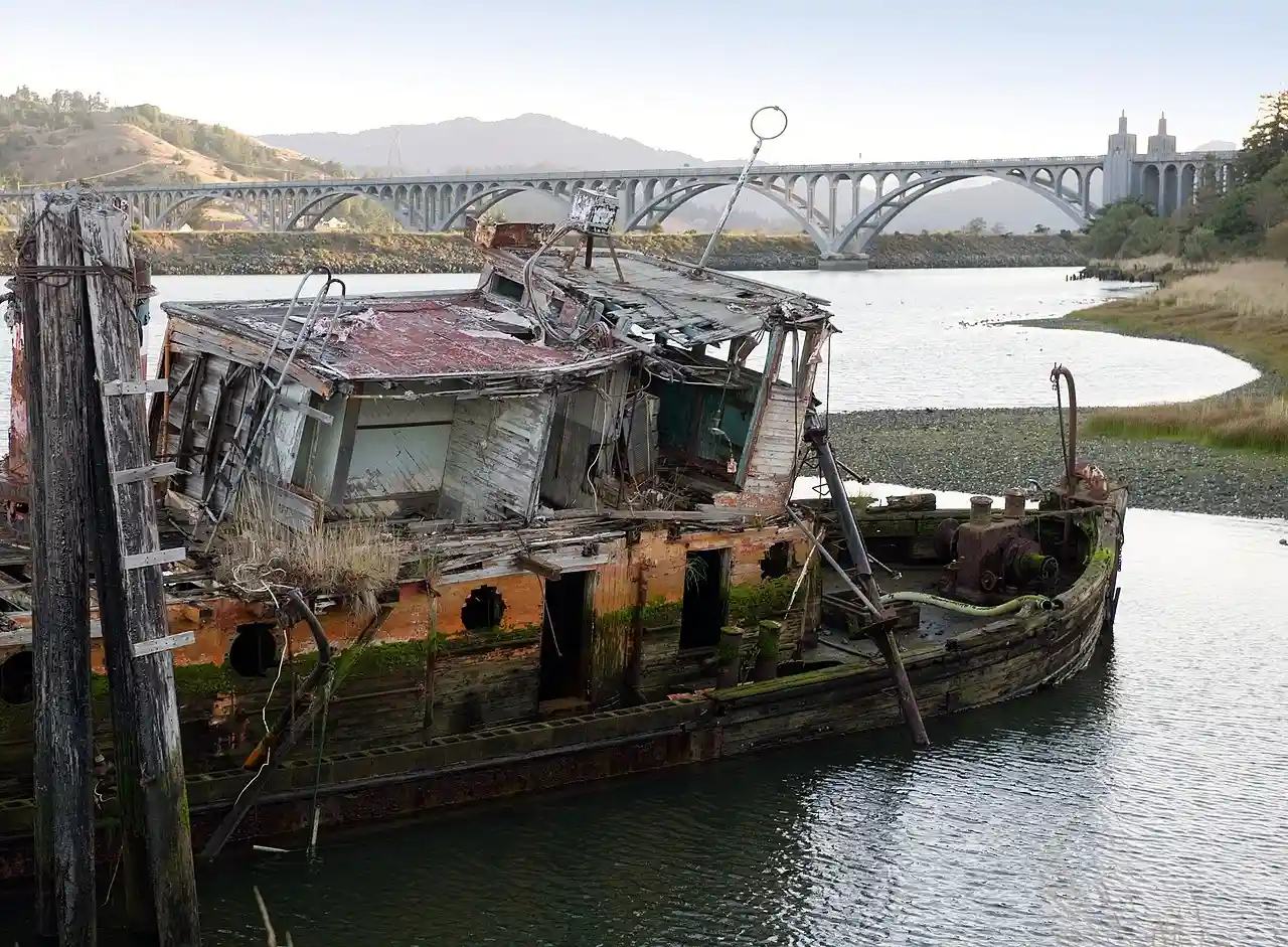 The Mary D. Hume was a steamer built at Gold Beach, Oregon in 1881, by R. D. Hume, a pioneer and early businessman in that area. Gold Beach was then called Ellensburg. The Hume had a long career, first hauling goods between Oregon and San Francisco, then as a whaler in Alaska, as a service vessel in the Alaskan cannery trade, then as a tugboat. She was retired in 1977 and returned to Gold Beach. In 1985 she sank in the Rogue River and has remained there ever since as a derelict vessel on the shoreline. The Hume is listed on the National Register of Historic Places. Read more on Wikipedia