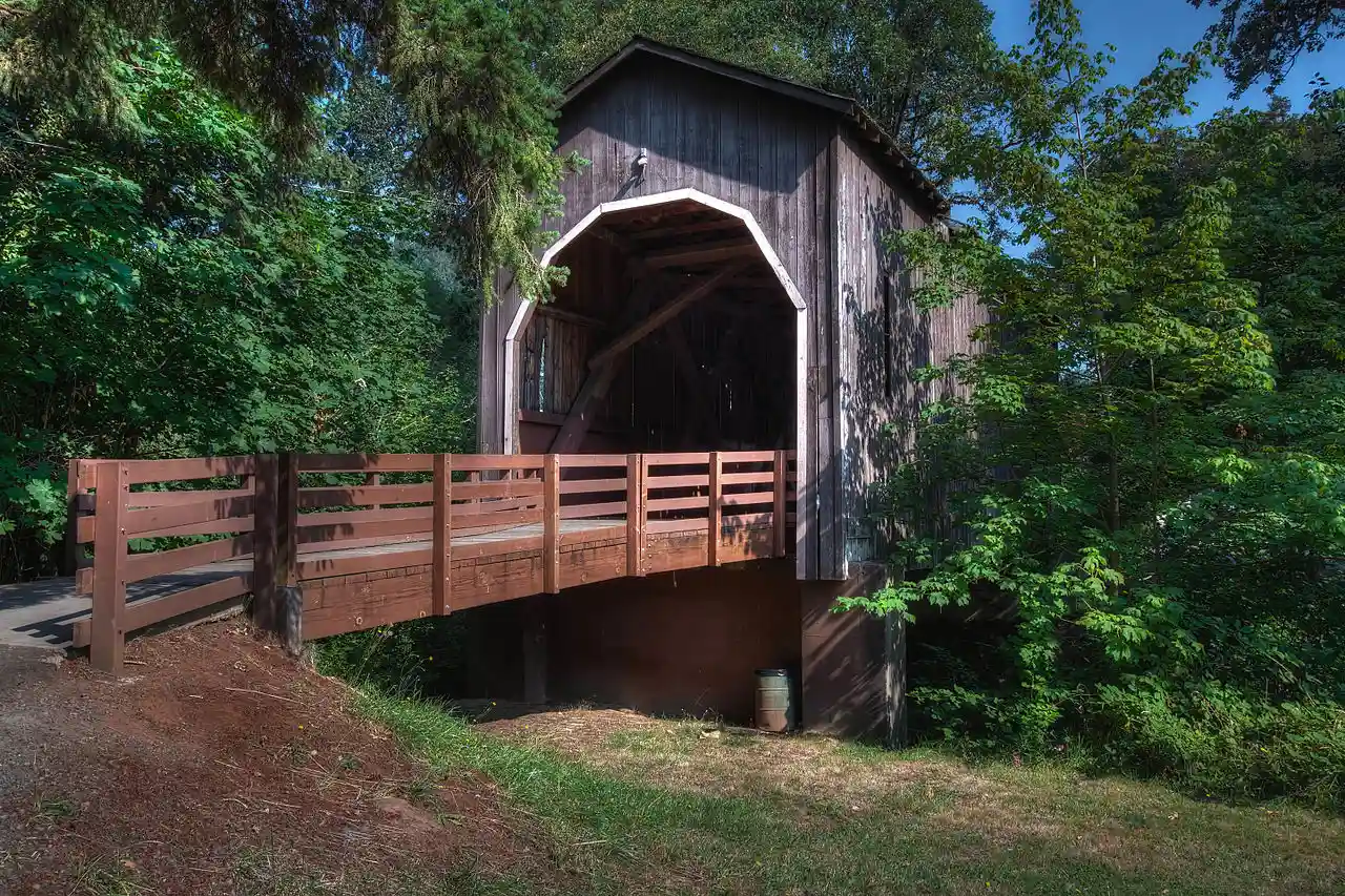 Pass Creek Bridge is a covered bridge in the city of Drain in Douglas County in the U.S. state of Oregon. It originally carried stagecoaches over Pass Creek before being moved a few hundred feet from its original location in 1987 and reassembled behind the Drain Civic Center. From then through 2014, when the city closed the deteriorating bridge completely, it carried pedestrian traffic. Pass Creek is a tributary of Elk Creek in the Umpqua River basin. Read more on Wikipedia