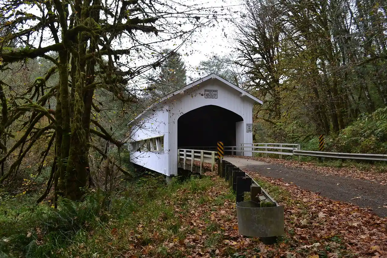 The Deadwood Creek Bridge is a covered bridge in western Lane County in the U.S. state of Oregon. Built in 1932, the Howe truss structure carries Deadwood Loop Road over Deadwood Creek. The crossing lies upstream of the rural community of Deadwood in the Siuslaw National Forest of the Central Oregon Coast Range. The bridge was added to the National Register of Historic Places in 1979. Read more on Wikipedia