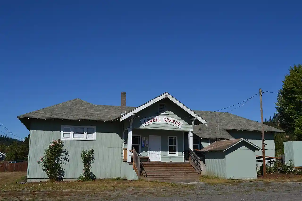 The Lowell Grange, also known as Lowell School, in the rural community of Lowell, Oregon, was built in 1940 as a school building. Later, although in historic era, it was renovated to be used as a Grange hall. It was listed on the National Register of Historic Places in 2005. Read more on Wikipedia