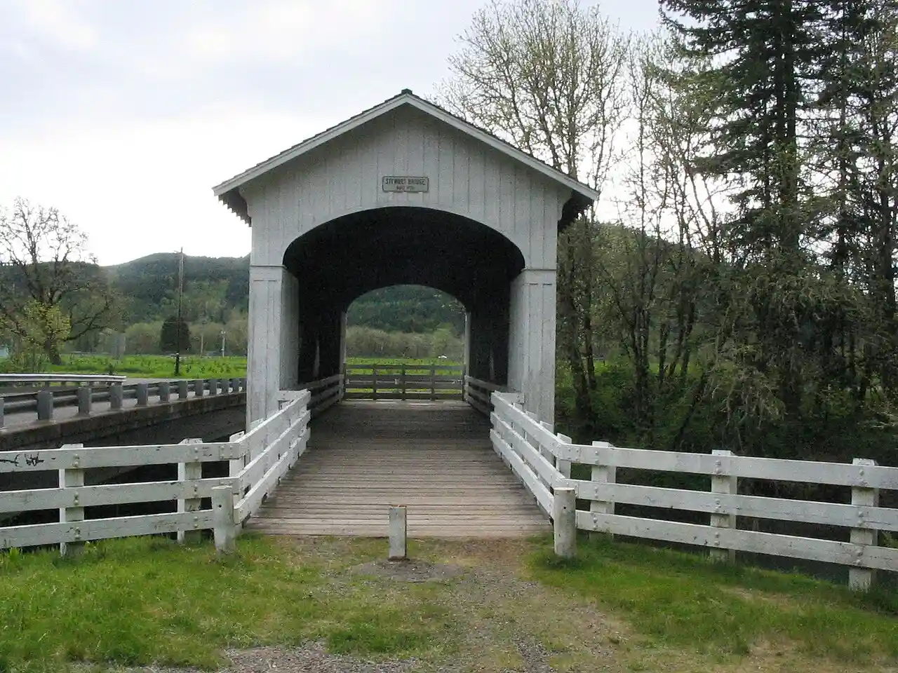 Stewart Bridge is a Howe truss covered bridge built in 1930 near Walden, Oregon, United States, in Lane County. It was listed on the National Register of Historic Places in 1979. It is long and crosses Mosby Creek, a tributary of the Row River. Read more on Wikipedia