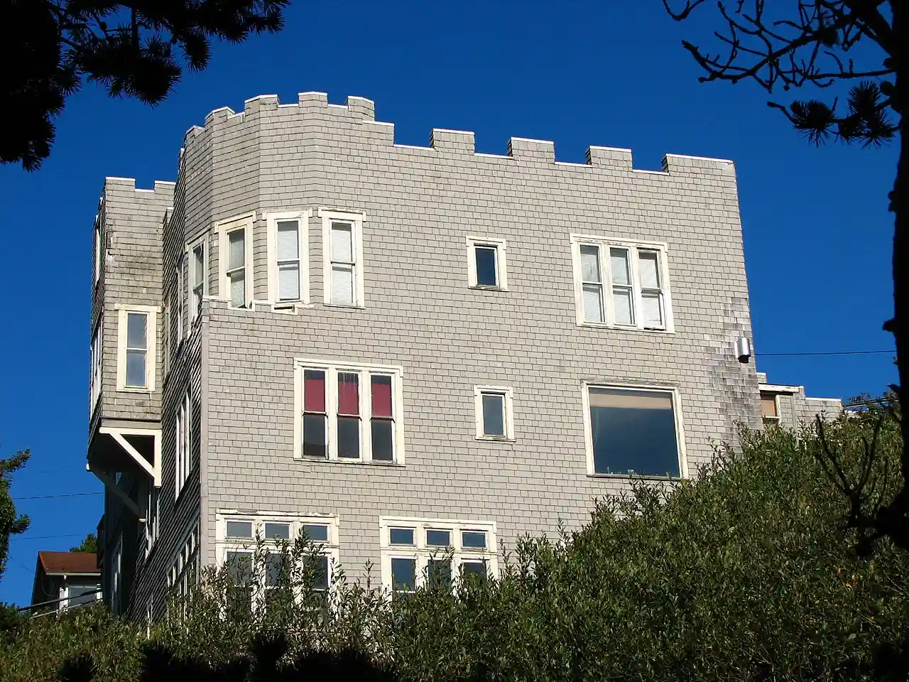 The Charles and Theresa Roper House, also known as Hilan Castle, is a historic residence located in Newport, Oregon, United States. Built in 1912–1913 to evoke a castle in the Scottish Highlands, it features such Medieval-inspired elements as a crenellated parapet, mullioned windows, a rounded corner tower, and a cantilevered turret. It is one of very few examples of the Castellated Gothic Revival style in Oregon, other than local armories. Its first owners, both Canadian immigrants, were locally notable figures: Charles Roper was a professional photographer whose work comprises an important documentary record of central Lincoln County in the 1910s and 1920s. He was elected mayor of Newport in 1922, and maintained a photography studio on the top floor of his house. Theresa Roper was the writer and illustrator of several books of romanticized history, and was a collector of local Native American objects that she used as a basis for her illustrations.. Read more on Wikipedia