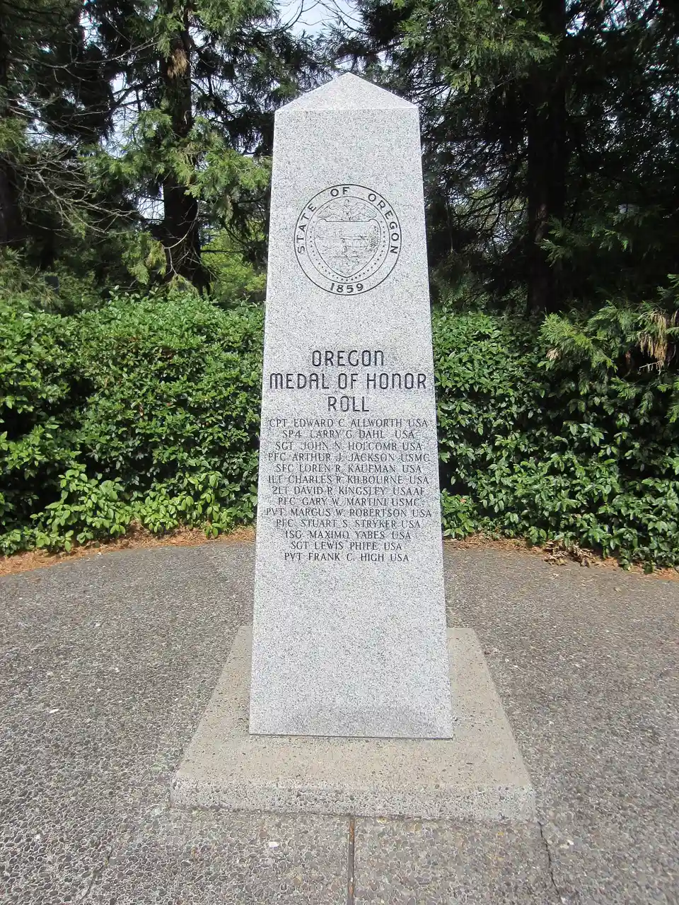 The Medal of Honor Monument, also known as the Oregon Medal of Honor Roll, is a granite obelisk commemorating Oregon's Medal of Honor recipients, installed outside the Oregon Department of Veterans' Affairs Building in Salem, Oregon, United States. Cut from a step leading to the Oregon State Capitol, the memorial is a replica of the state's monument in the Medal of Honor Grove Freedom Foundation at Valley Forge, Pennsylvania. Read more on Wikipedia