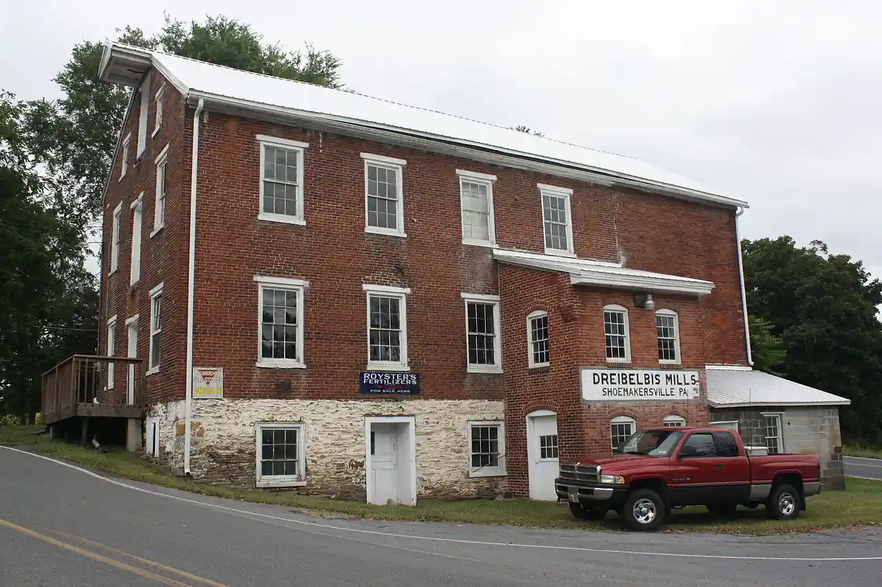 Dreibelbis Mill is a historic grist mill located in Perry Township, Berks County, Pennsylvania. The mill was built in 1854, and is a -story, brick building on a banked stone basement. The mill remained in operation until 1985. After 1944, it was powered by a diesel engine. Note: This includes Read more on Wikipedia