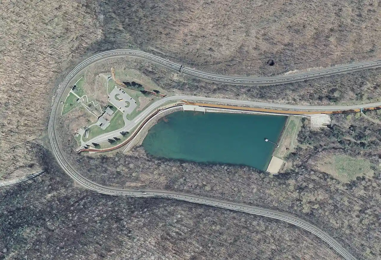 The Horseshoe Curve is a three-track railroad curve on Norfolk Southern Railway's Pittsburgh Line in Blair County, Pennsylvania. The curve is roughly long and in diameter. Completed in 1854 by the Pennsylvania Railroad as a way to reduce the westbound grade to the summit of the Allegheny Mountains, it replaced the time-consuming Allegheny Portage Railroad, which was the only other route across the mountains for large vehicles. The curve was later owned and used by three Pennsylvania Railroad successors: Penn Central, Conrail, and Norfolk Southern. Read more on Wikipedia