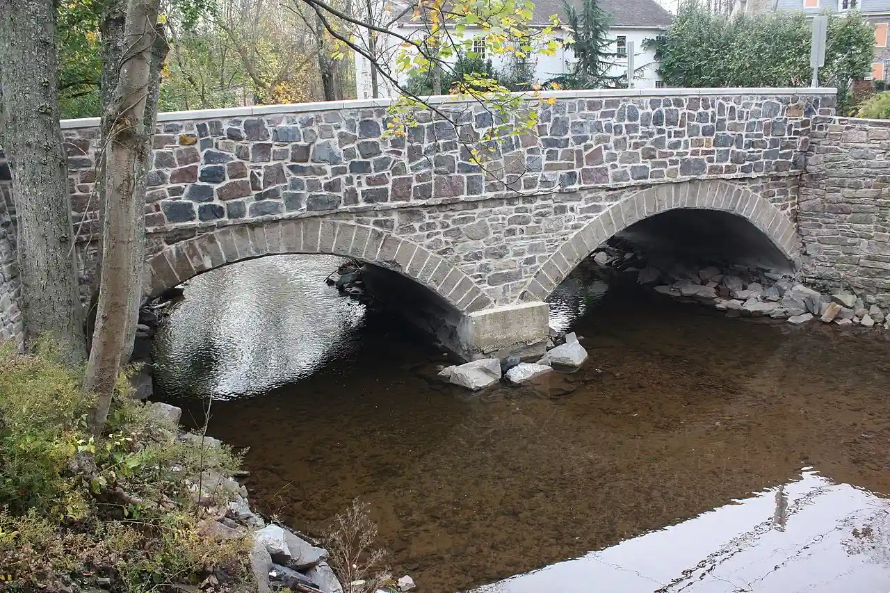 The Bridge in Solebury Township is an historic stone arch bridge located at Carversville in Solebury Township, Bucks County, Pennsylvania, United States. It has two spans, each 20 feet long, and was constructed in 1854. It is constructed of roughly squared stone. Note: This includes Read more on Wikipedia