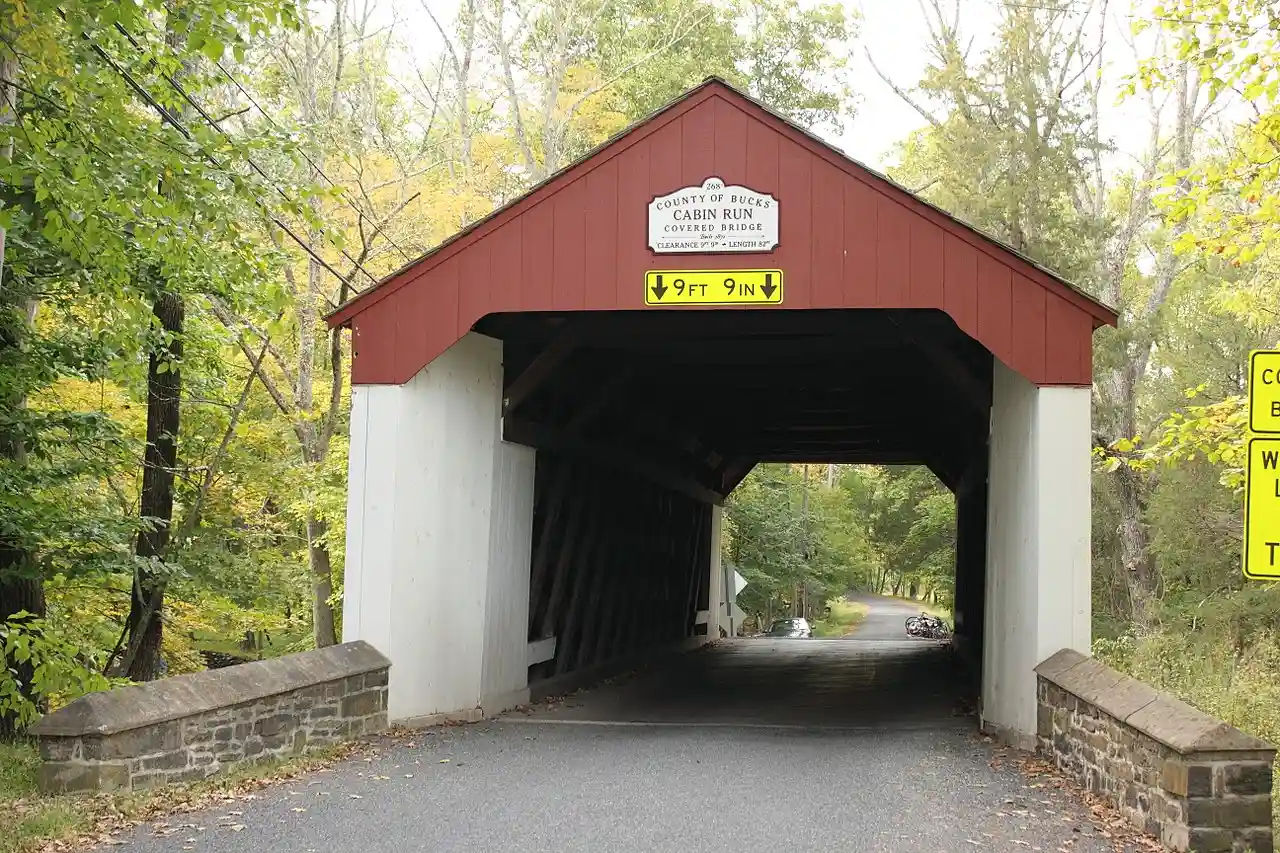 The Cabin Run Covered Bridge is a historic covered bridge located in Point Pleasant, Plumstead Township, Bucks County, Pennsylvania. The bridge was built in 1871, and is wide and has a length of . The Town truss bridge crosses Cabin Run (creek) downstream from the Loux Covered Bridge. Note: This includes Read more on Wikipedia