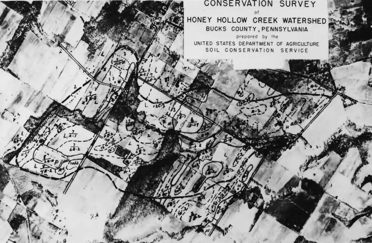 The Honey Hollow Watershed is a watershed on the south side of the Delaware River a few miles north of New Hope, Pennsylvania. It is the site of the first privately owned soil conservation district in the United States. Created by five landowners in 1933, it was successful in mitigating the effects of erosion caused by the introduction of modern agricultural methods in the early 20th century. The area was designated a National Historic Landmark District in 1969. and Read more on Wikipedia