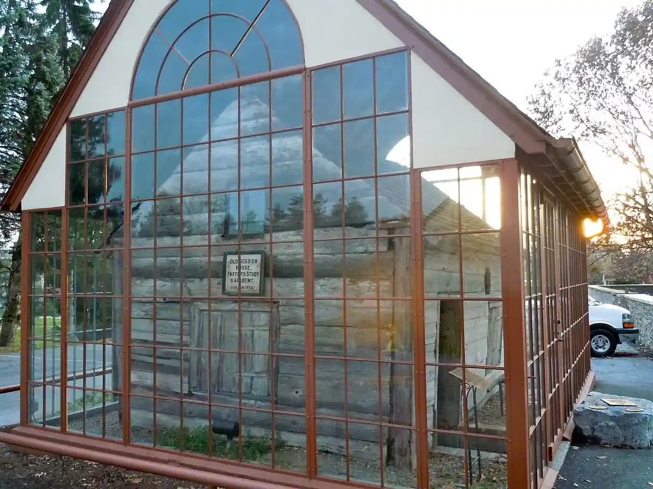 Derry Session House and Enclosure is a historic site located on the grounds of Derry Presbyterian Church at Derry Township, Dauphin County, Pennsylvania. It consists of the log Session House, built about 1732, and a glass enclosure, erected in 1929. The hewn log Session House measures 18 feet by 13 feet and is one story high and was built for a Presbyterian session. The glass and steel enclosure measures approximately 24 feet by 19 feet, 6 inches, and sits on a reinforced concrete foundation. The Enclosure, whose construction was originally funded by Milton S. Hershey, was refurbished in 1999. Note: This includes Read more on Wikipedia