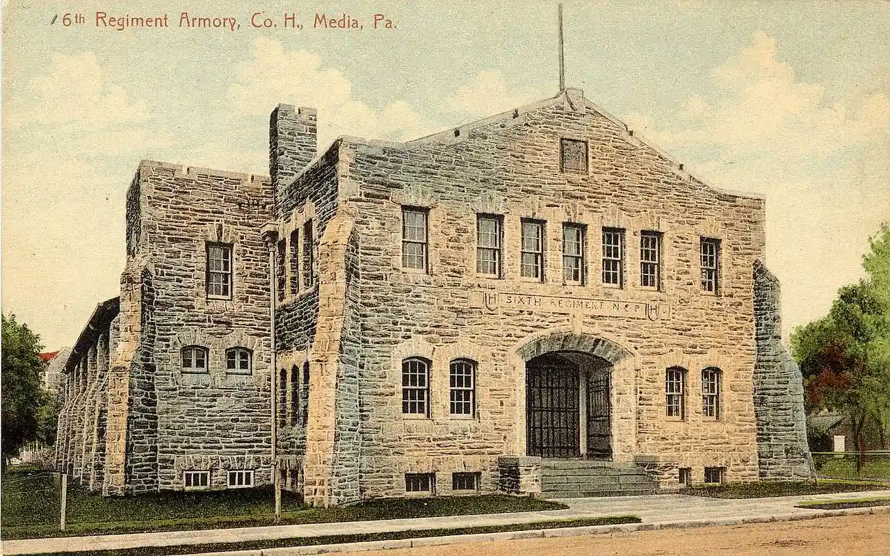 The Media Armory, is a historic National Guard Armory located in Media, Delaware County, Pennsylvania built in 1908 for Company H of the 6th Infantry Regiment of the Pennsylvania National Guard. Read more on Wikipedia