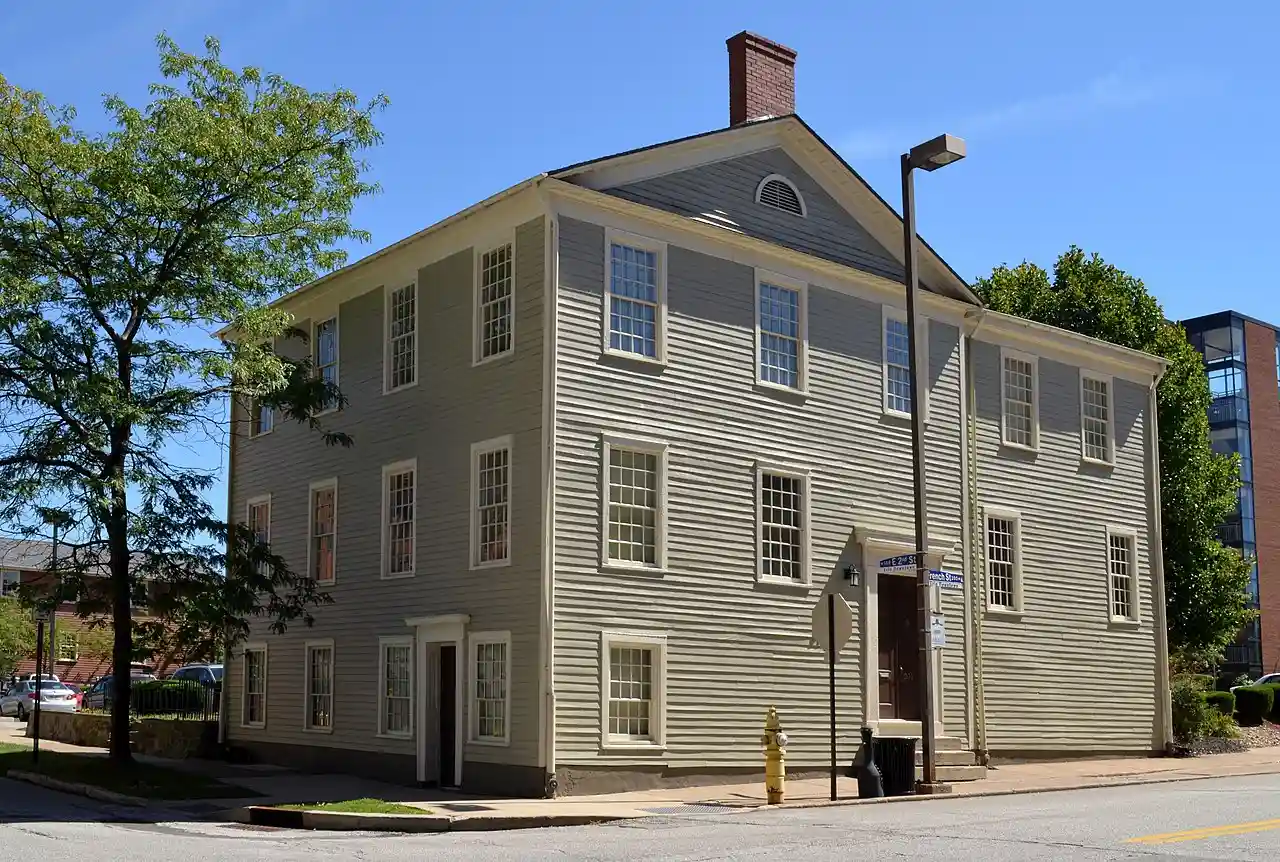 The Dickson Tavern, or the Perry Memorial House, is the oldest building in the city of Erie in the U.S. state of Pennsylvania. Located at the corner of 2nd and French Streets in downtown Erie, the structure was listed on the National Register of Historic Places in 1990. The three-story Federal and Greek Revival-style building was constructed in 1815 by William Himrod and owned by John Dickson. It was acquired by the city of Erie in 1924. The Dickson Tavern was documented by the Historic American Buildings Survey (HABS) in 1936. Read more on Wikipedia