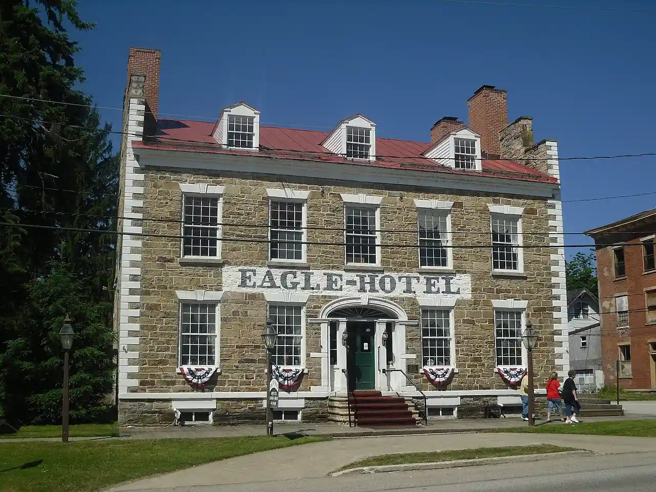 The Eagle Hotel, also called the Stone Hotel, is a former hotel built in 1826 in Waterford, Erie County in the U.S. state of Pennsylvania. It was documented by the Historic American Buildings Survey in 1933 and was listed on the National Register of Historic Places on November 28, 1977. The first floor of the Eagle Hotel is used by the Sugar 'n Spice restaurant, with the second and third floors used as a museum by the Fort Le Boeuf Historical Society. Read more on Wikipedia