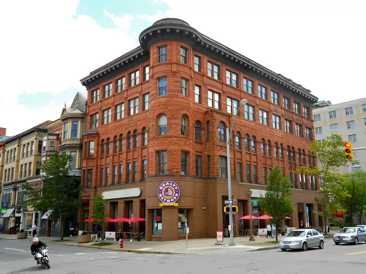 Dime Bank Building, also known as the Dime Bank & Trust Company Building, is a historic commercial building located at Scranton, Lackawanna County, Pennsylvania. It is a five-story brick building in the Richardsonian Romanesque style. The original three-story building was built in 1890-1891, and measured . Soon after, an additional two-stories were added, as well as a wing measuring . In 1908, the building was again expanded with a concrete and slab fireproof wing. The facade features a delicately ornamented bay window, five-story turret, and three-story rectangular projection terminated at the third floor by a large arched masonry opening. Note: This includes Read more on Wikipedia