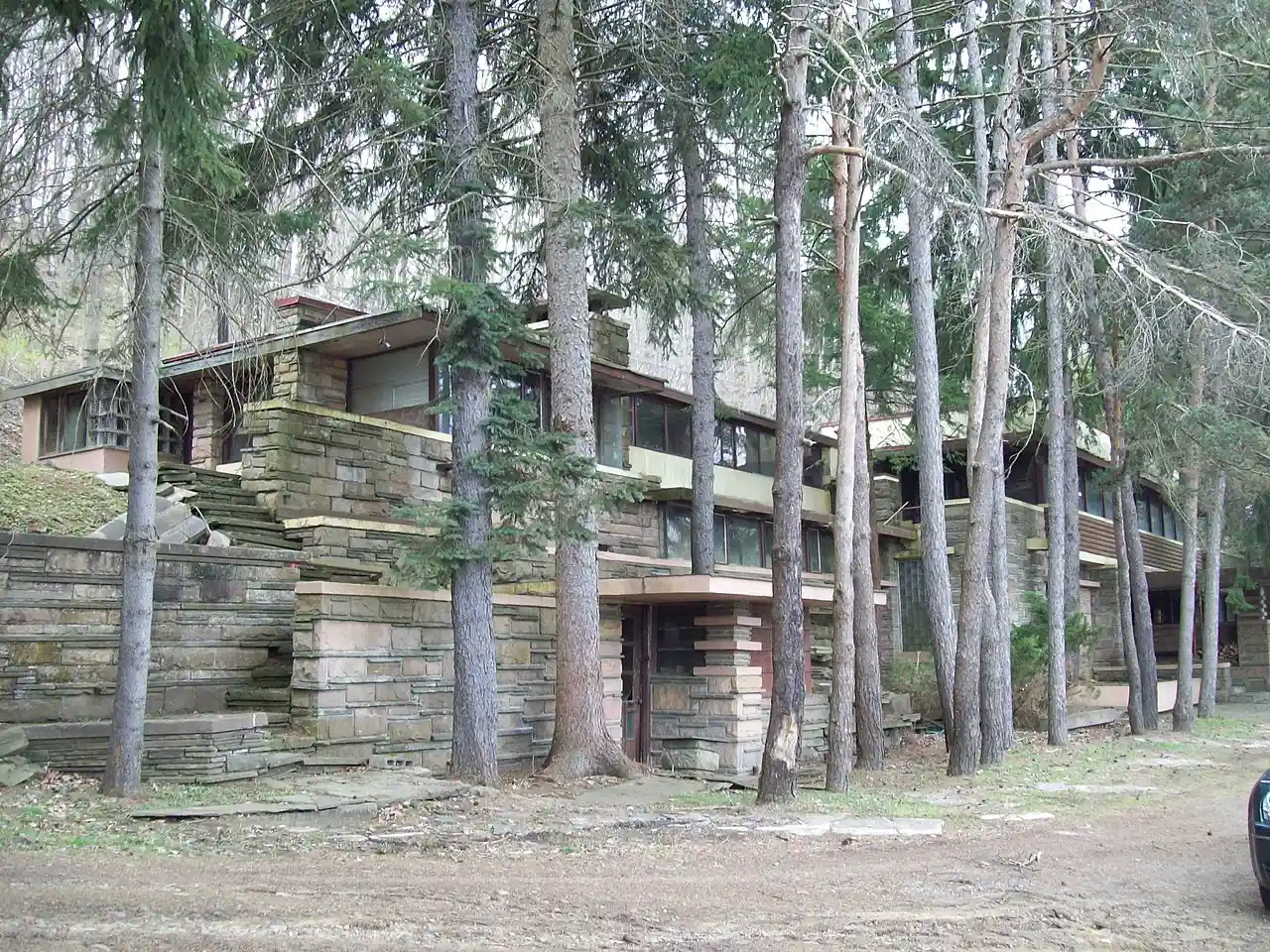 Lynn Hall was originally designed as a restaurant, dance hall and family residence located in Port Allegany, Pennsylvania, United States. It is a sprawling Modernist Movement style structure designed and built by Walter J. Hall — a self-taught practitioner of the style. The first phase was completed in 1935. Lynn Hall slightly resembles the design for Fallingwater (designed by Frank Lloyd Wright) because in 1936 Walter was asked to join the Fallingwater project as general manager and chief stone mason. Read more on Wikipedia