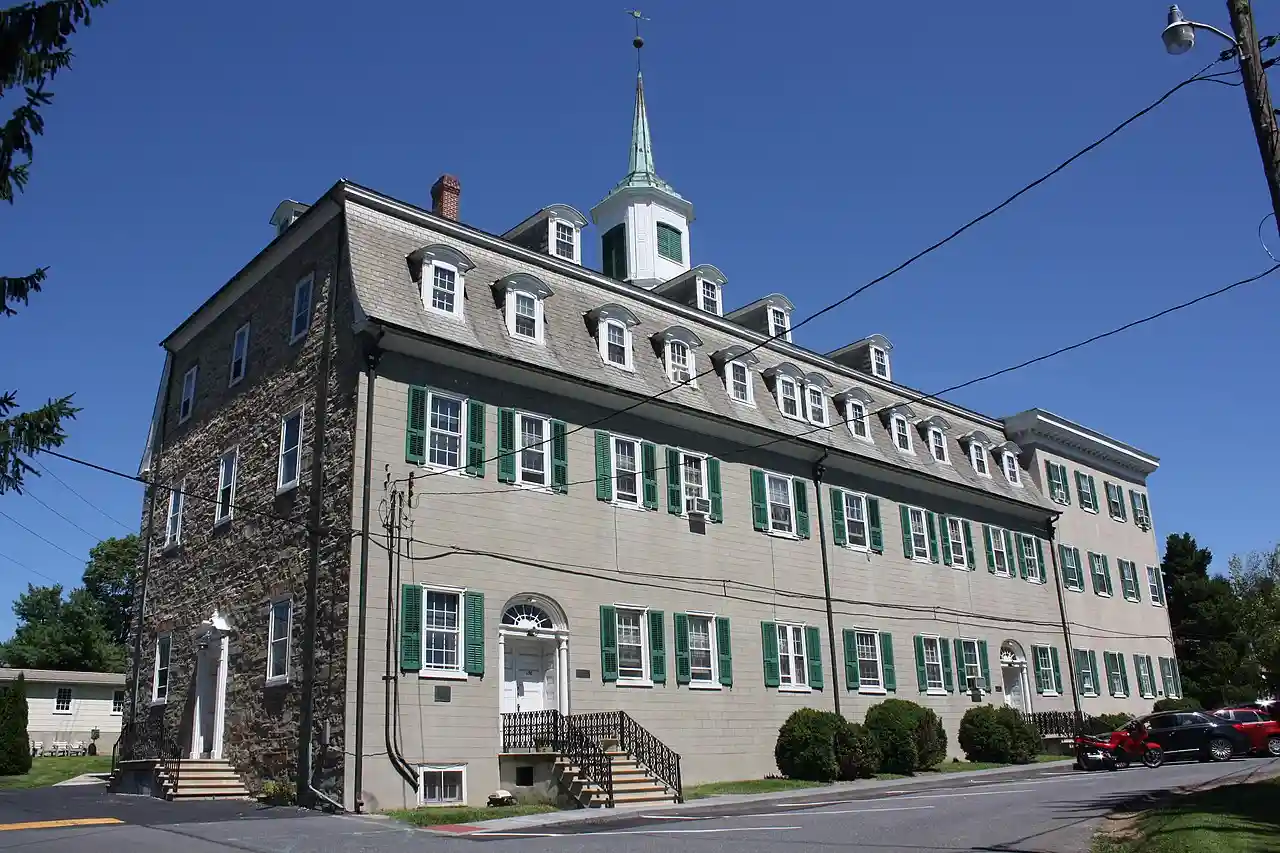 Nazareth Hall Tract is a historic Moravian school complex located at Nazareth, Northampton County, Pennsylvania. It consists of the manor house Nazareth Hall, the 1840 Moravian Church, the "First Room" Building (Parsonage), the Principal's House, the Single Sister's House, and a monument. In 1759, it became the central boarding school for sons of Moravian parents known as Nazareth Hall. The school closed in 1928-1929. Read more on Wikipedia
