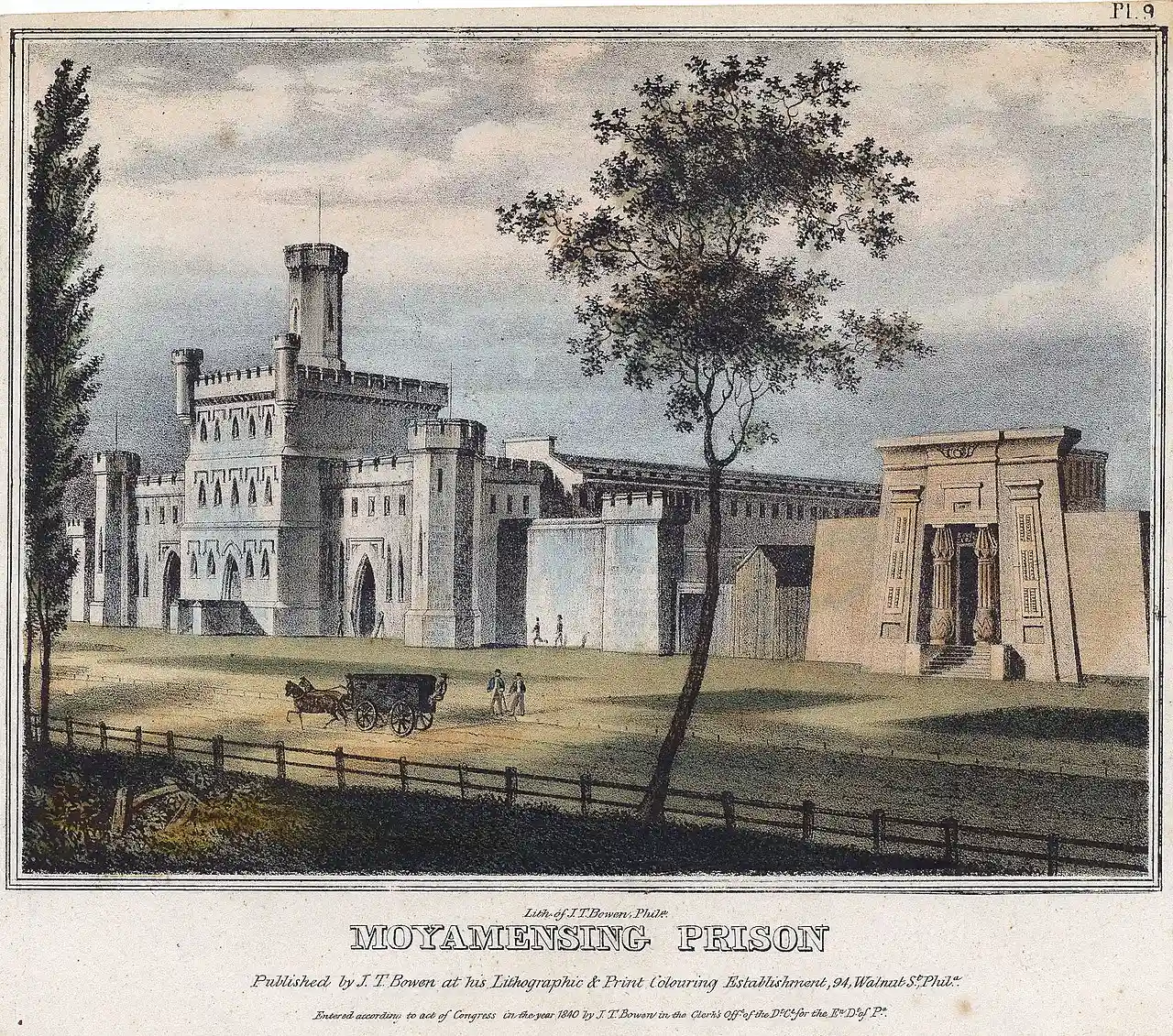 Moyamensing Prison was a prison in Philadelphia, in the U.S. state of Pennsylvania. It was designed by Thomas Ustick Walter. Its cornerstone was laid on April 2, 1832; it opened on October 19, 1835, was in use until 1963, and was demolished in 1968. For nearly 140 years the Moyamensing Prison dominated the southwest corner of the intersection of Passyunk Avenue and Reed Street in South Philadelphia. Read more on Wikipedia