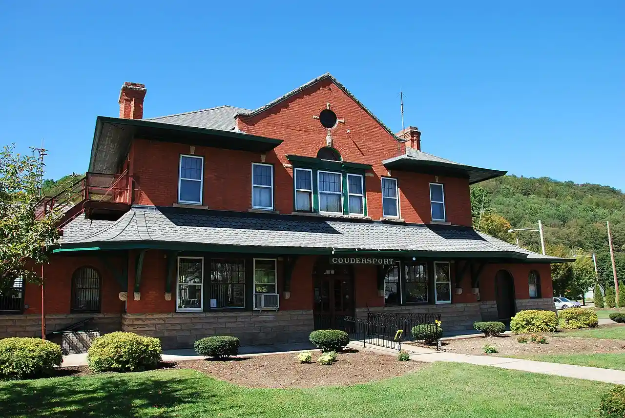 The Coudersport and Port Allegany Railroad Station (also known as the Coudersport Depot) is a railroad station in Coudersport, Pennsylvania, in the United States. It was built by the Coudersport and Port Allegany Railroad in 1899 and opened in January 1900 during the lumber industry boom in Potter County. When the lumber ran out, the railroad's business decreased and in 1964 the line and station were purchased by the Wellsville, Addison and Galeton Railroad. The station was abandoned in 1970 and was unoccupied until 1975, when the borough of Coudersport purchased it. The borough restored it and put a new roof on, then used the building for office space. The station was listed on the National Register of Historic Places on November 21, 1976. Read more on Wikipedia