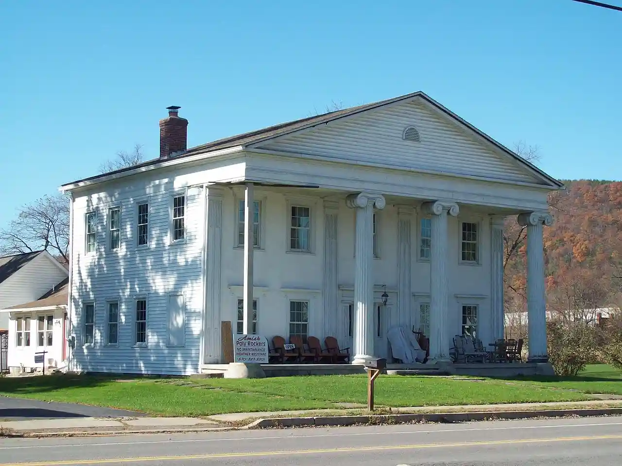 Judge John Ryon House, or Judge Ira Kilbourne House, is a historic home located at Lawrenceville in Tioga County, Pennsylvania. It is a two-story Greek Revival style house built in 1840. It features a two-story portico with three full fluted Ionic columns and one somewhat less fluted column. Read more on Wikipedia
