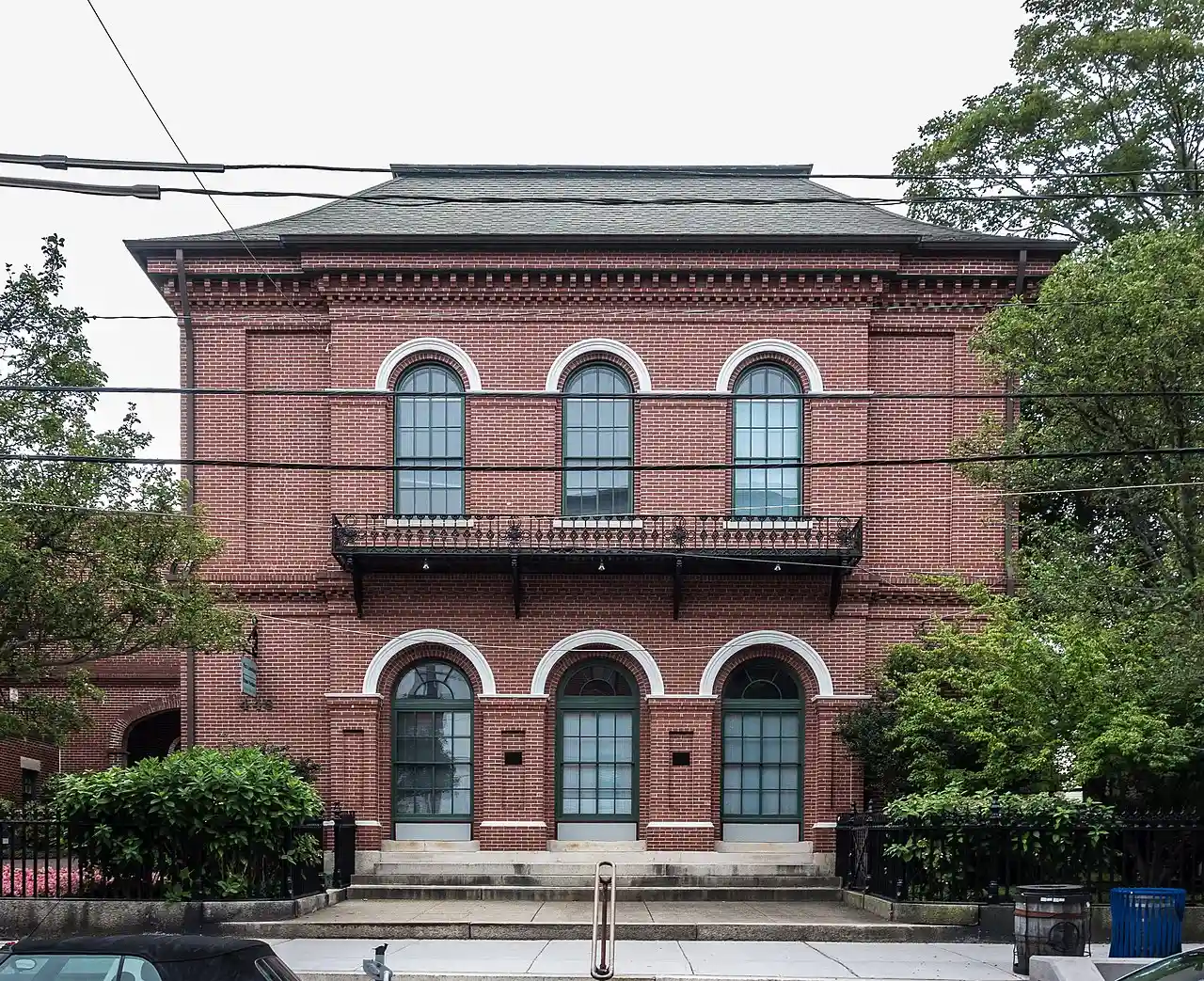 Bristol Customshouse and Post Office is a historic two-story rectangular Italian palazzo style brick building that was used as a post office and customshouse in Bristol, Rhode Island, United States. The land for the site was acquired for $4,400. The building was designed by Ammi B. Young and completed in 1858 for a cost of $22,135.75. The building roughly measures by and is constructed of deep red brick and has three arched openings on each of its sides and stories that are lined with sandstone moldings. The archways protrude from the side of the building and the center archway serves as the first floor with the adjacent archways housing large windows that are barred with iron. As it typical of the style, the second floor is more elaborate with a shallow balcony of iron supported by iron brackets and the paneling of the upper facade's surmounting entablature is elaborately decorative. The sides and rear are similar to the front facade, but include blind recesses and the molding is of a browner sandstone. Read more on Wikipedia