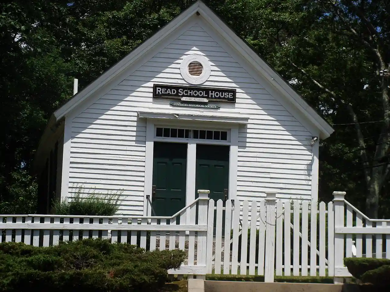 The Read School is a historic schoolhouse at 1670 Flat River Road in Coventry, Rhode Island, USA. Built c. 1831, it is one of the oldest, and the best-preserved, of Coventry's 19th-century schoolhouses. It is a rectangular wood-frame structure measuring by , with a gable roof. The south side, its main facade, has a pair of doors under a ten-light transom window and a shallow entry cover. Above this is a round window, a detail echoed on the north side. It served the town as a school until 1951, and was then used for storage. It is now leased by the town to the Coventry Historical Society, who conduct tours and hold meetings there. Read more on Wikipedia