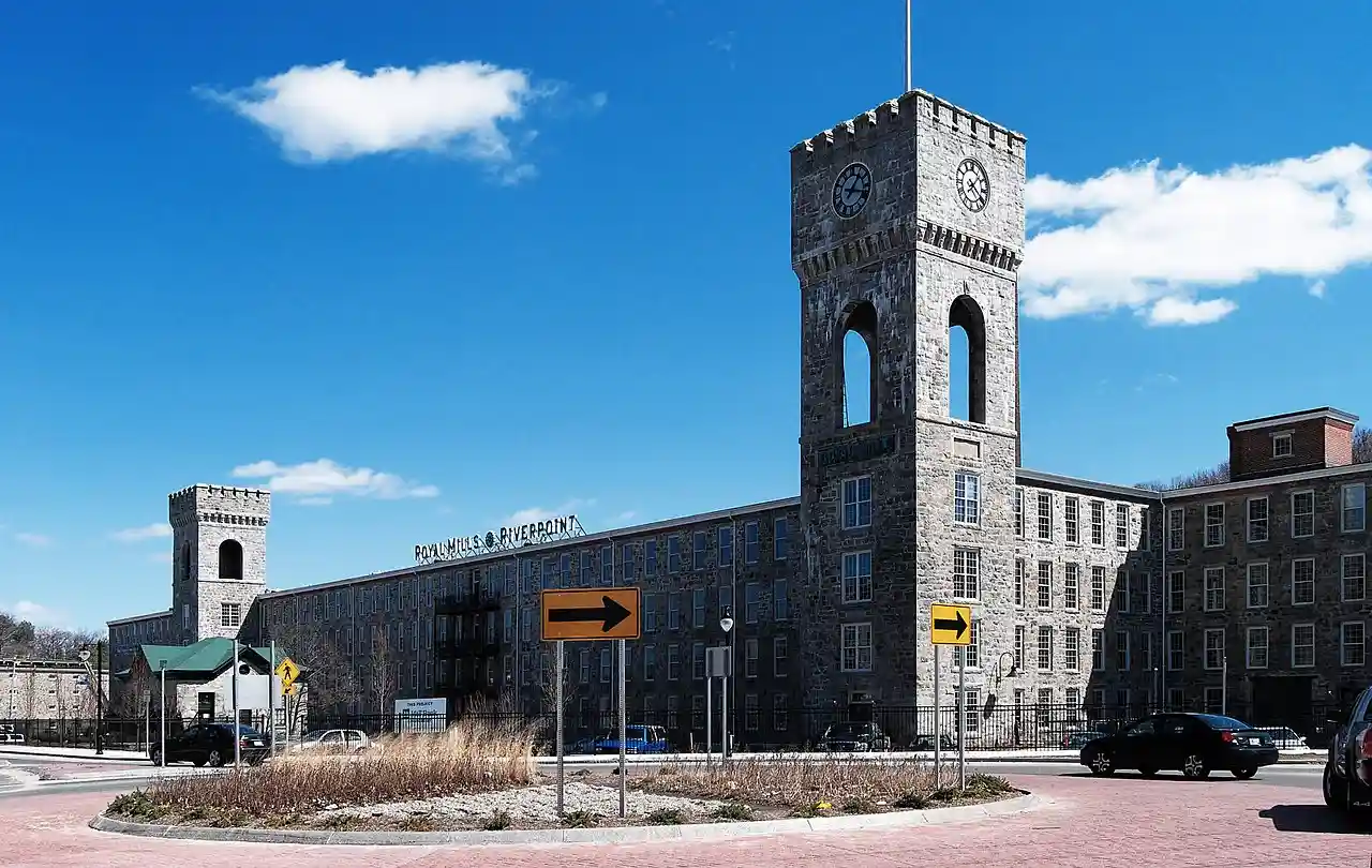 The Royal Mill Complex is an historic textile mill site at 125 Providence Street in West Warwick, Rhode Island. The mill complex was listed on the National Register of Historic Places in 2004. It has recently been completely renovated and remodeled into 250 residential apartments. The complex also includes the Ace Dye Works mill on the south side of the river, which has been converted into lofts. A pedestrian skybridge connects the two mills. Read more on Wikipedia