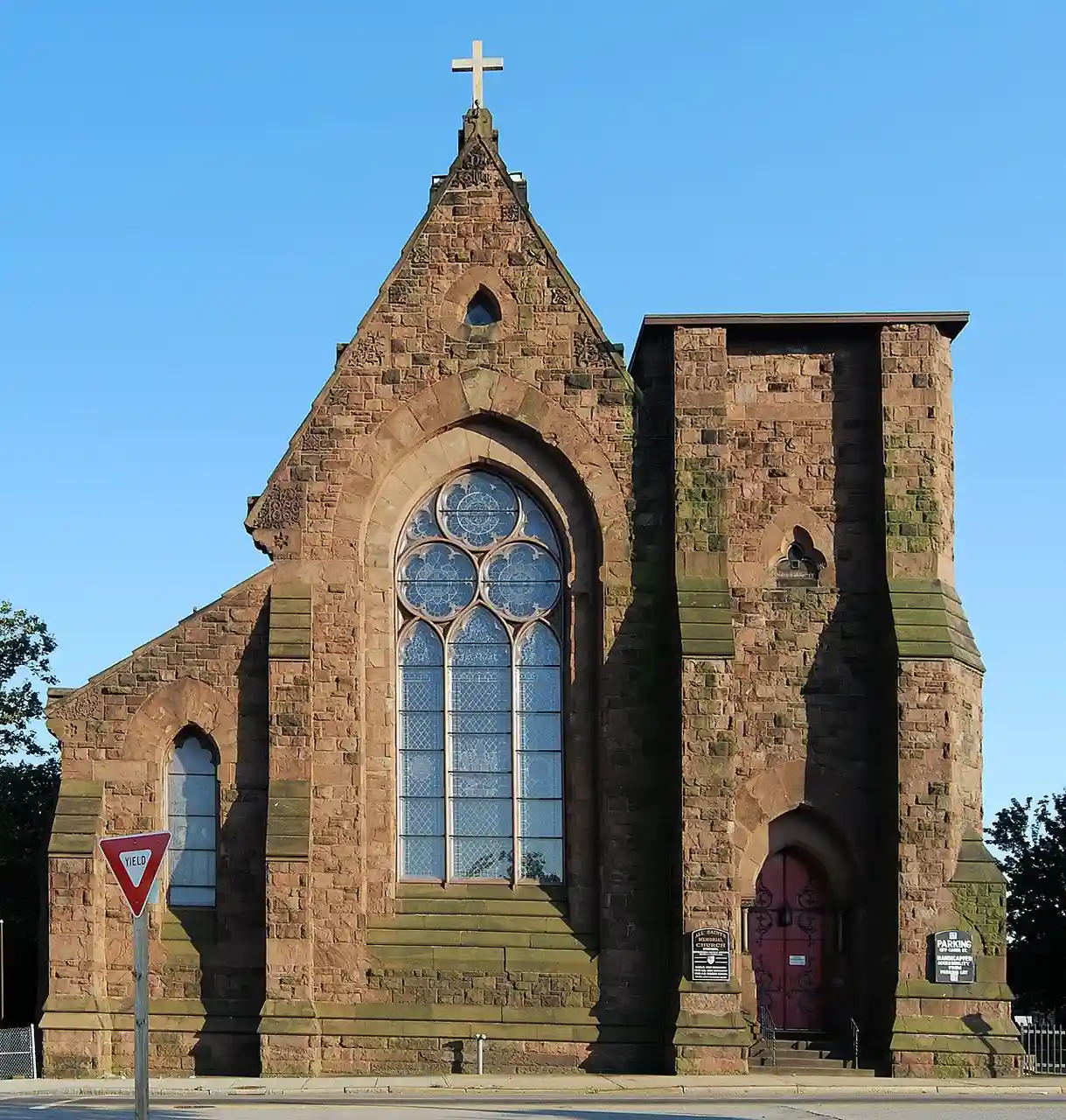 All Saints Memorial Church is a historic Episcopal church at 674 Westminster Street in Federal Hill, Providence, Rhode Island. The current church building, a large brownstone structure with a flat-topped tower, was designed by architect Edward Tuckerman Potter in a Gothic, Tudor Revival style, and built from 1869 to 1872. It is the largest Episcopal church building in the state, and its only known Potter-designed church. The accompanying (now-demolished) parish house is a Tudor Revival structure designed by Gorham Henshaw and built in 1909. Read more on Wikipedia