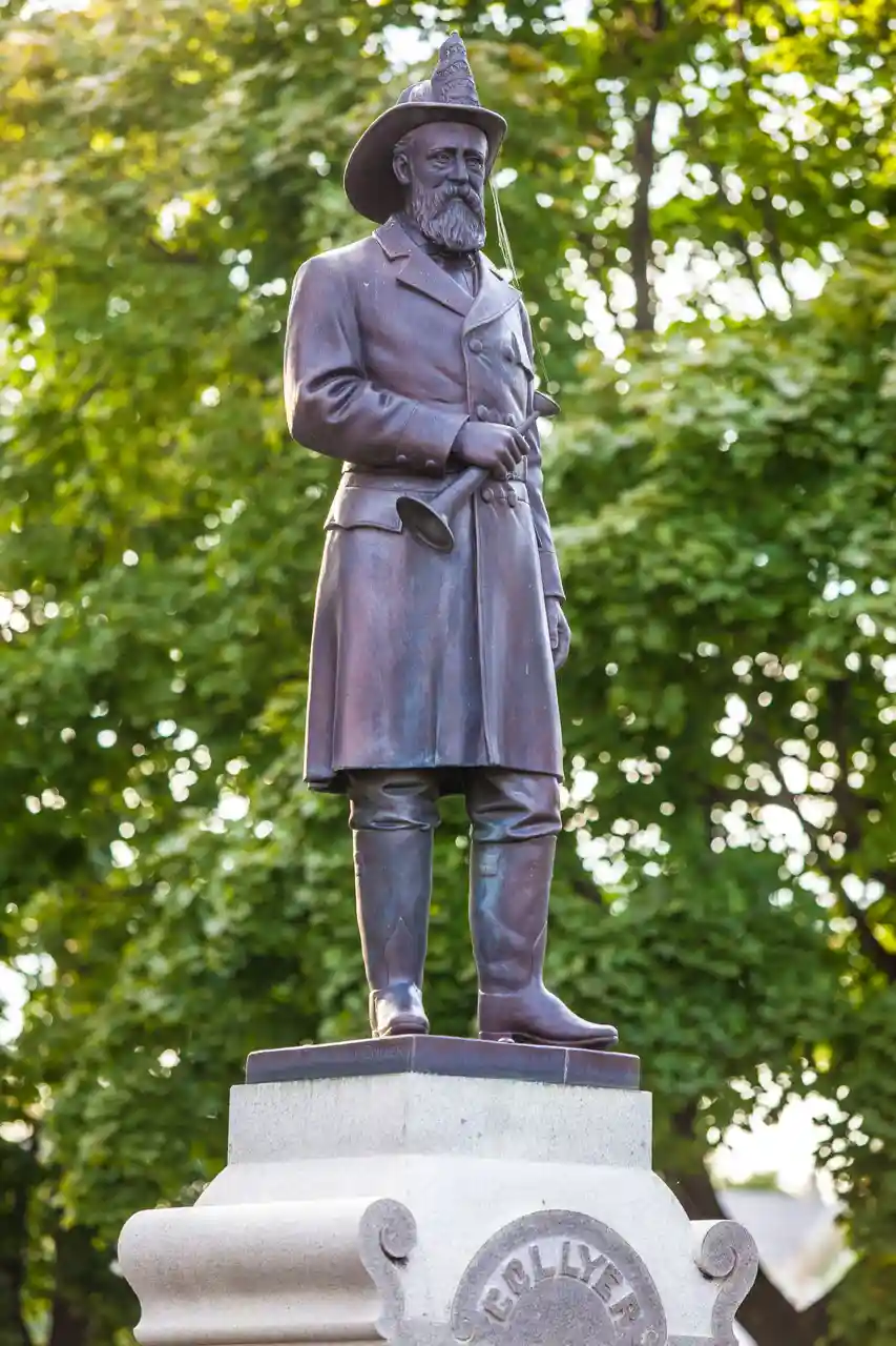 Collyer Monument is an historic monument to firefighters in Mineral Spring Park, at the corner of Mineral Spring Avenue and Main Street, in Pawtucket, Rhode Island, United States. The monument was built in 1890 by the sculptor Charles Parker Dowler to honor Samuel Smith Collyer, a fallen Pawtucket Fire Chief. The life-size bronze sculpture stands atop a pedestal of Westerly granite, which has a bronze plaque depicting the fatal accident while the reverse bears an inscription. The memorial represents a significant example of monumental work of the period and an early example of local civic pride. The monument was added to the National Register of Historic Places in 1983. Read more on Wikipedia