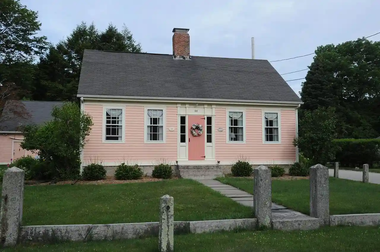 The Esbon Sanford House is an historic house at 88 Featherbed Lane in North Kingstown, Rhode Island. It is a -story wood-frame structure, five bays wide, with a central chimney and simple Federal-Greek Revival transitional styling. The main entry, centered on the front facade, is framed by small sidelight windows and pilasters, and is topped by an entablature. The most unusual feature of the house relates to its chimney: despite its central location, the interior of the house is organized in a central hall plan, with the flues of the flanking chambers rising at an angle and joining in the attic space to form the single chimney seen outside. The house was probably built in 1832 by Esbon Sanford, who established a textile mill nearby that same year. Read more on Wikipedia