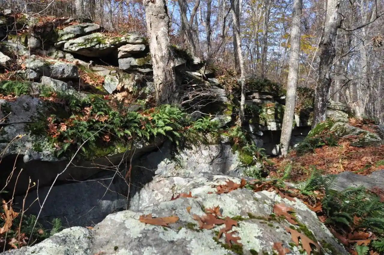 The Tomaquag Rock Shelters (RI-HP-1) are a prehistoric rock shelter site off Maxson Hill Road (formerly Burdickville Road) in Hopkinton, Rhode Island. The shelters are located under two east-facing granite outcrops in the valley drained by Tomaquag Brook. Nathan Kaye discovered the shelters in the late 1950s. Materials recovered from test excavations resulted in dating one shelter to 800 BC and the other to AD 800. Materials recovered include projectile points, stone knives, and evidence of stone tool construction. Both sites included evidence pointing to the presence of a fire pit. Read more on Wikipedia