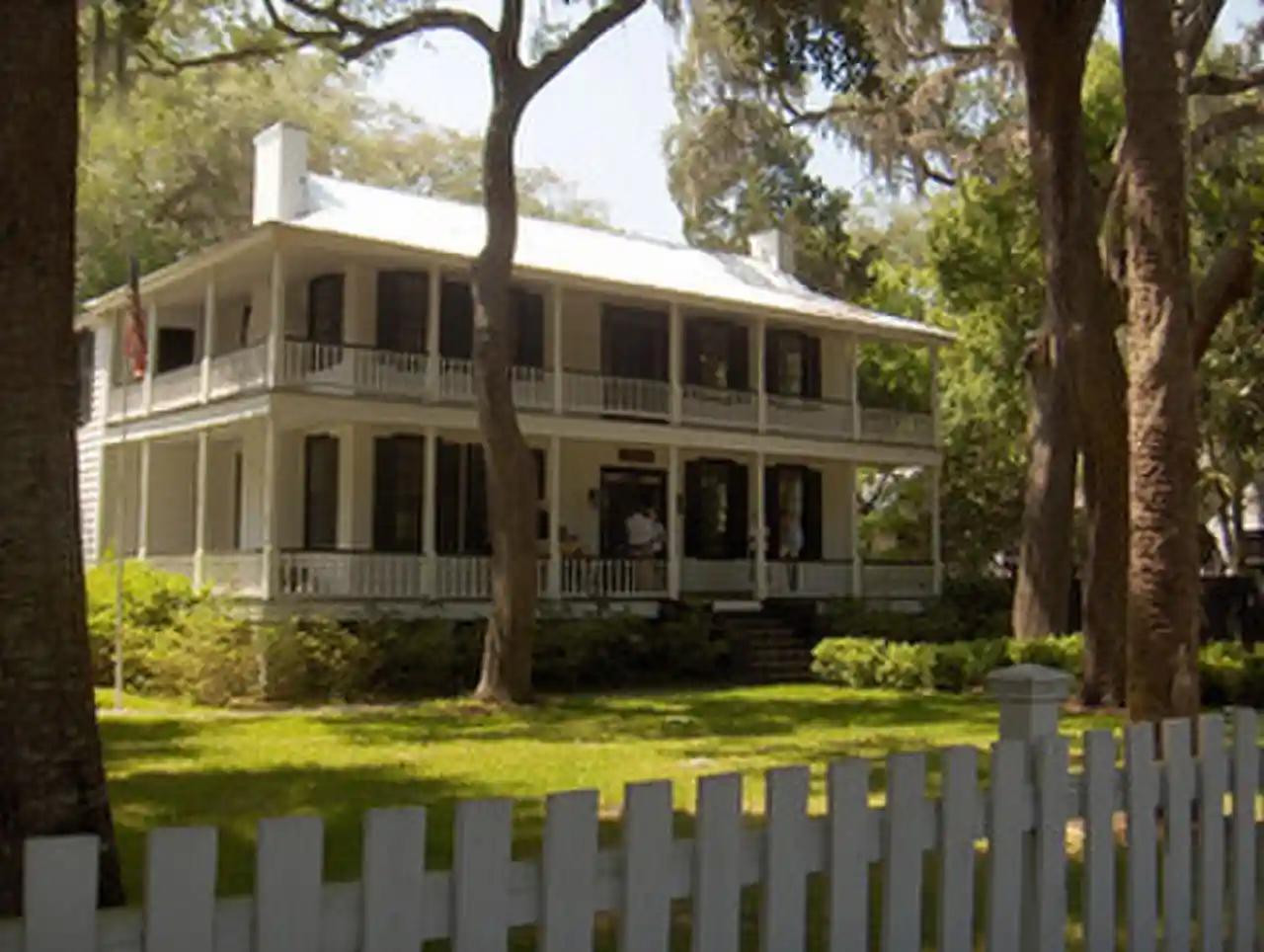 Seven Oaks is located in Bluffton, South Carolina. It was built in 1850. This is a two-story house with double verandas on the south and east sides and two exterior chimneys. The house is called Seven Oaks due to seven very large live oak stumps that support the house. Some of the original interior details remain; there is a visible line running east to west down the center of the northeast parlor floor indicating that an addition was made at some time. Read more on Wikipedia