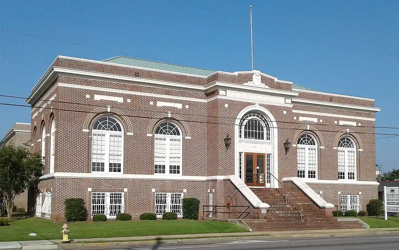 Florence Public Library, also known as the Florence County Public Library, is a historic library building located at Florence, Florence County, South Carolina. It was built in 1925, and is a two-story-over-raised-basement, T-shaped brick veneered building with Neo-Classical Revival architecture and Beaux Arts design influences. It has a concrete foundation, reinforced concrete walls, limestone decorative elements, and a standing seam metal roof. It was the first public library in Florence. In 1977-1978 the library built a large one-story expansion and made extensive renovations to the original 1925 building. Read more on Wikipedia