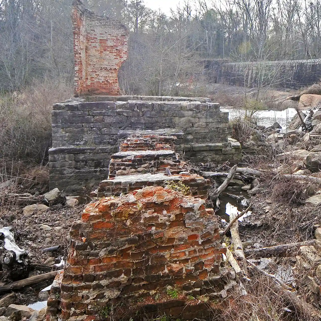 The Pelham Mills Site, sometimes referred to as the Buena Vista Factory, Hutchings Factory, or the Lester Factory, is the site of the ruins of the Pelham Mills cotton factory near Greer, South Carolina, on the shores of the Enoree River. Included on the property are stone and brick foundations, the bases of two steam smokestacks, brick pilings, and a mortared stone dam with six sluice gates across the Enoree River. Read more on Wikipedia